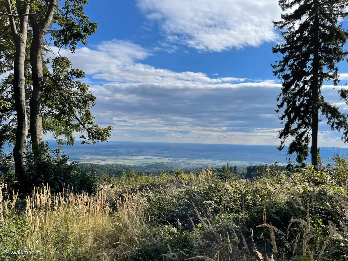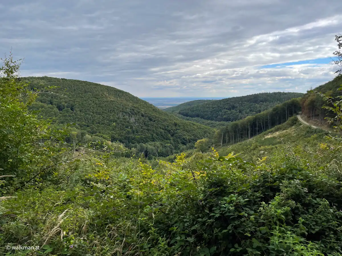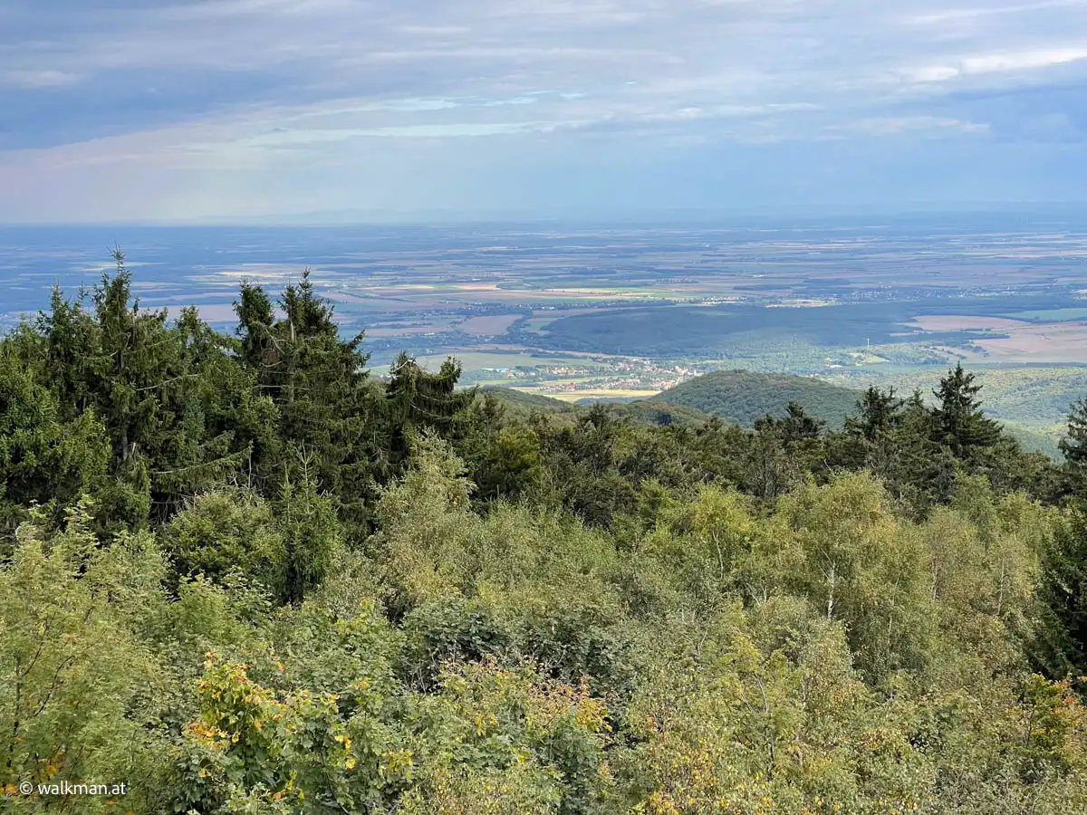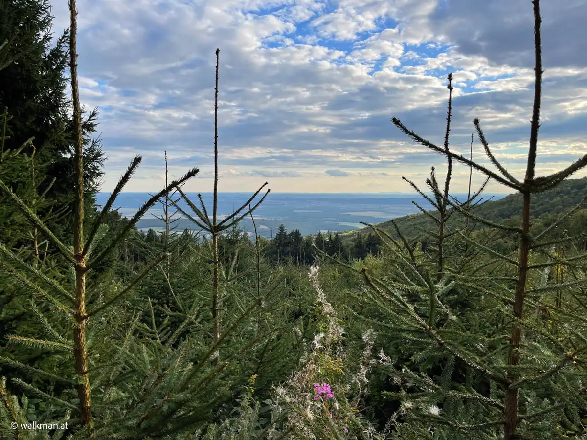 Das war keine falsche Entscheidung, wie man an obigem Bild erkennen kann. Hier ist ein richtig toller Fotopunkt. Und ein traumhaftes Panorama. Hinter vorgelagerten geschwungenen Hügeln sieht man weit bis nach Ungarn rein. Herrlich.