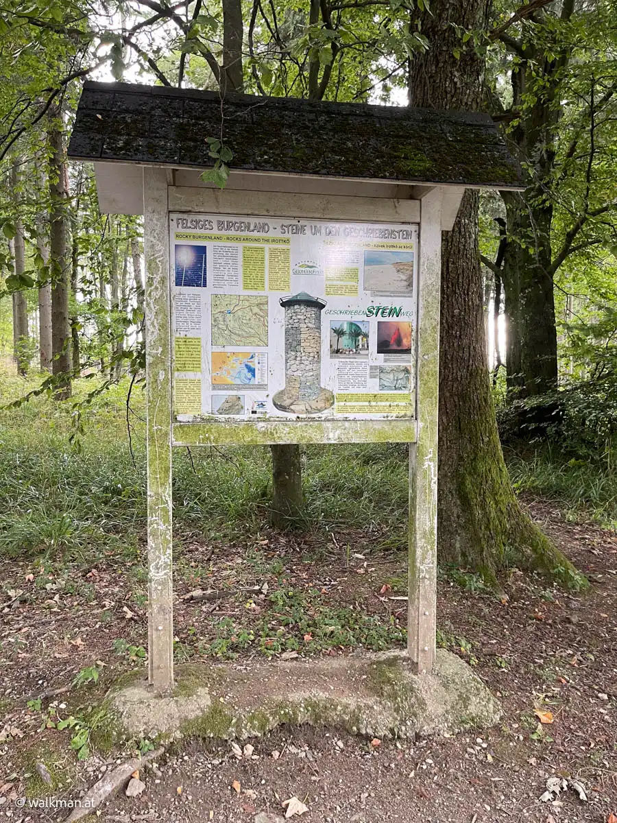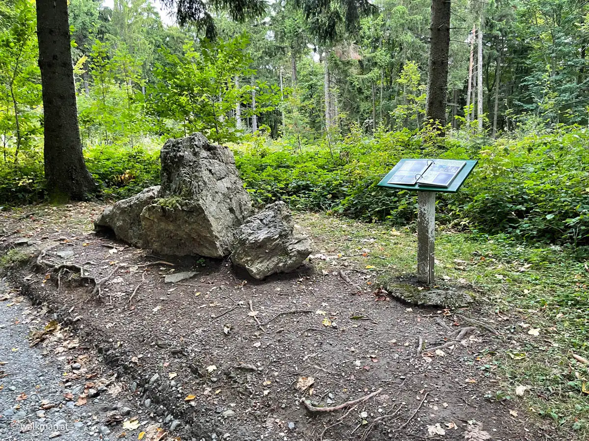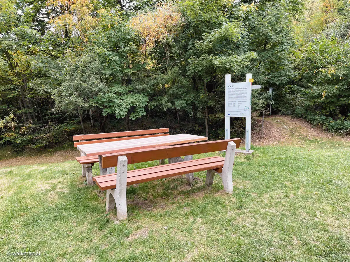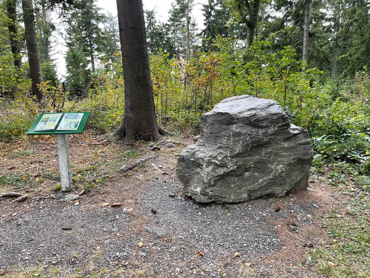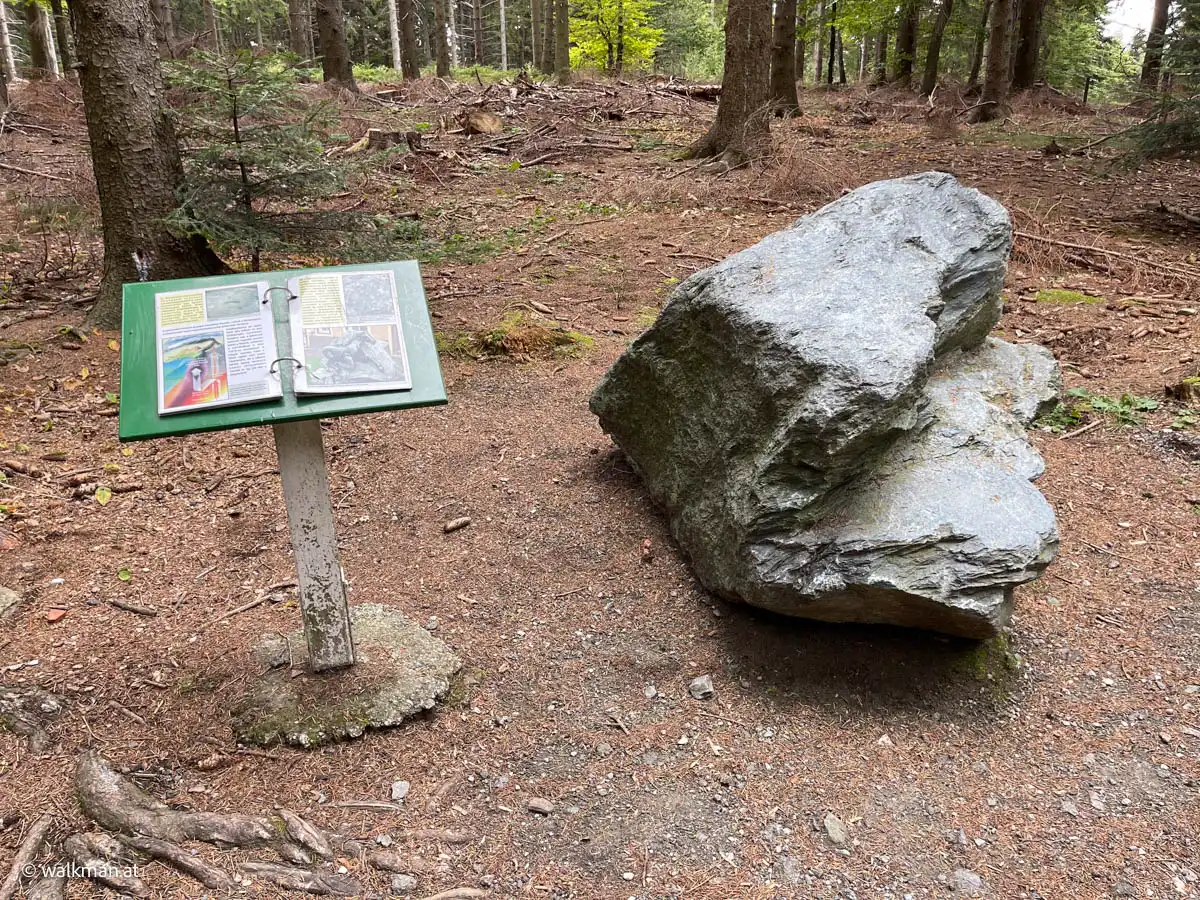 Immer wieder kommt man an Bänken und an beschilderten, künstlich angelegten Steinformationen vorbei. Der Steinlehrpfad – eine nette Idee. Und auch Bildung, für jenen der’s lesen mag. Ich entscheid mich gegen das Rasten und schritt meine Tour weiter. Es war mittlerweile schon 16 Uhr und das Wetter schien, wenn man die dunklen aufziehenden Wolken am Himmel betrachtete, nicht gerade stabil zu sein.