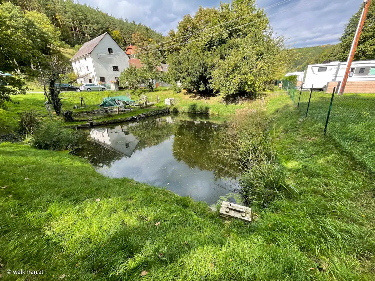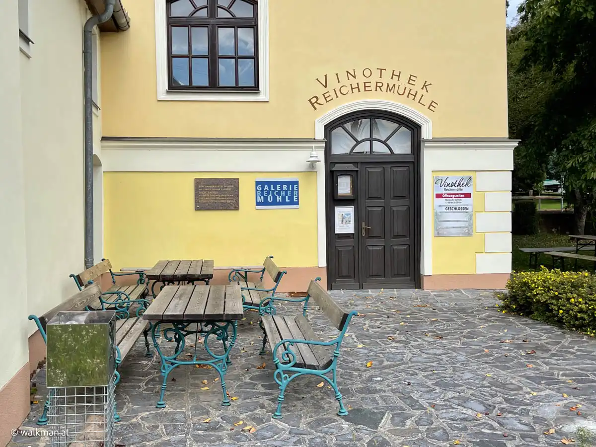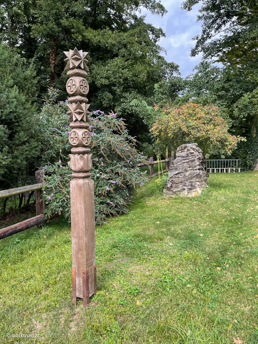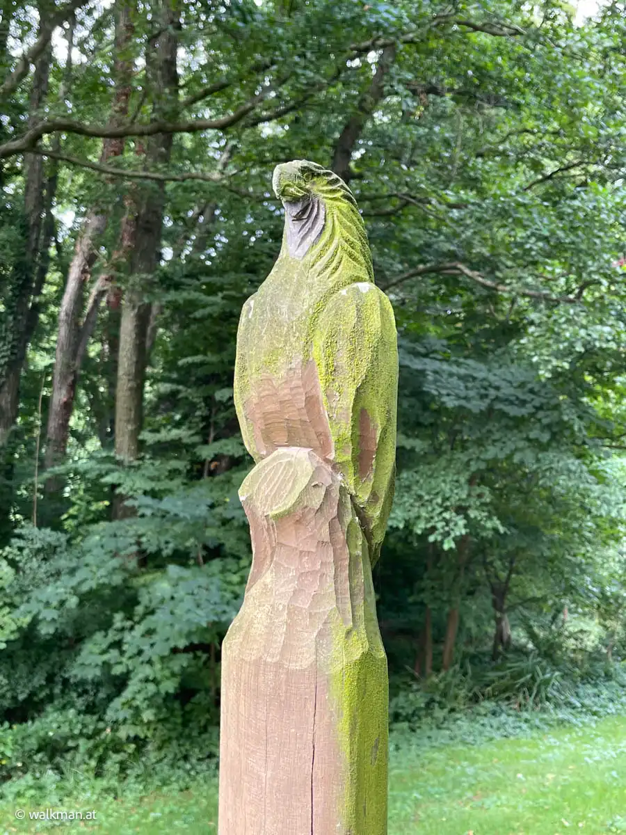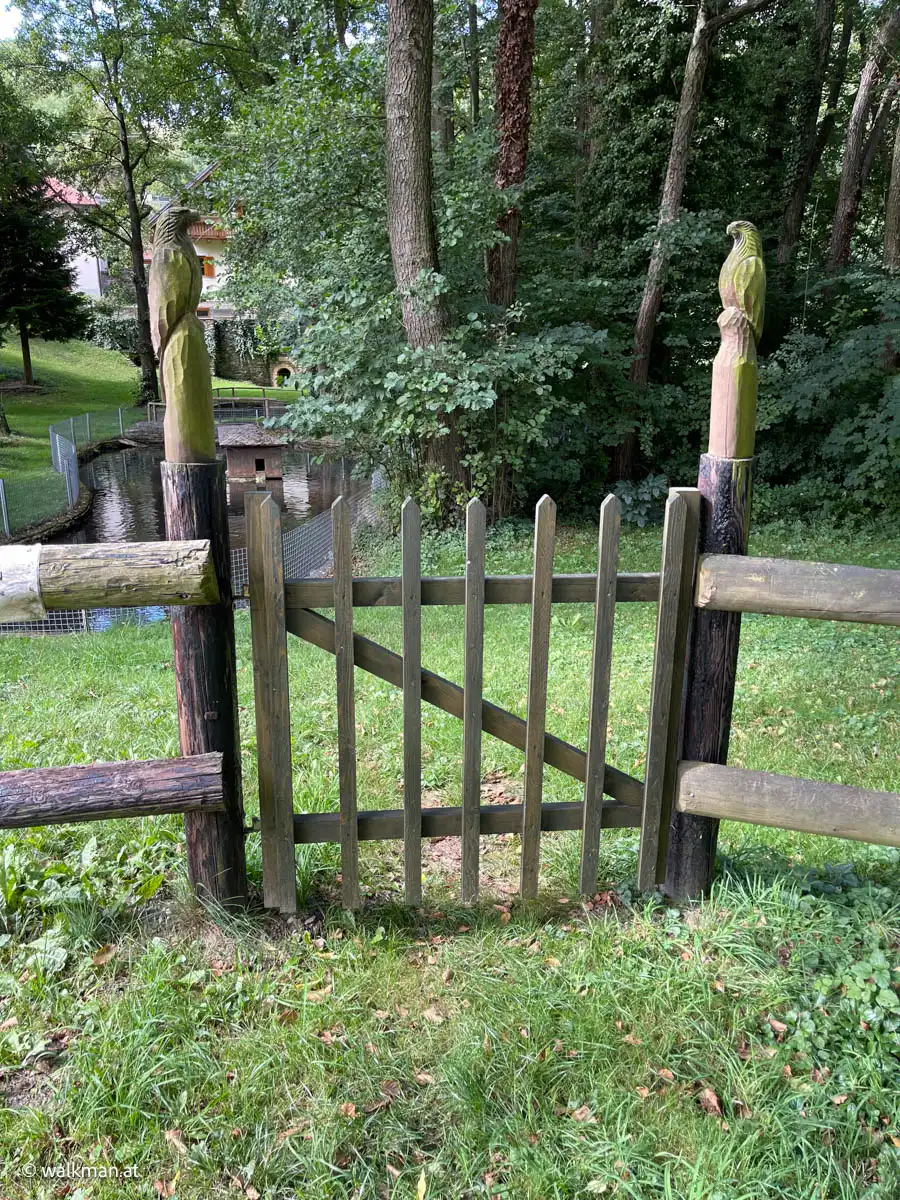 Hier kommt man auch beim Wandererkreuz und der Vinothek Reichermühle (mit Museum) vorbei. Fast übersehen hätte ich hier auch ein schönes Fleckerl abseits der Straße. Ein Fischteich mit schönen Holzschnitzereien beim Eingang. Links und rechts am Eingang scheinen die zwei hölzernen Adler das Areal zu bewachen.