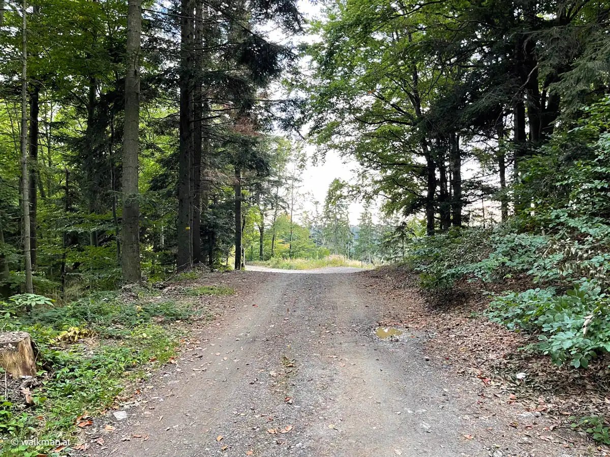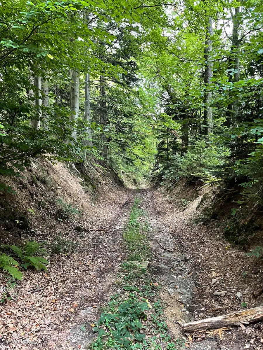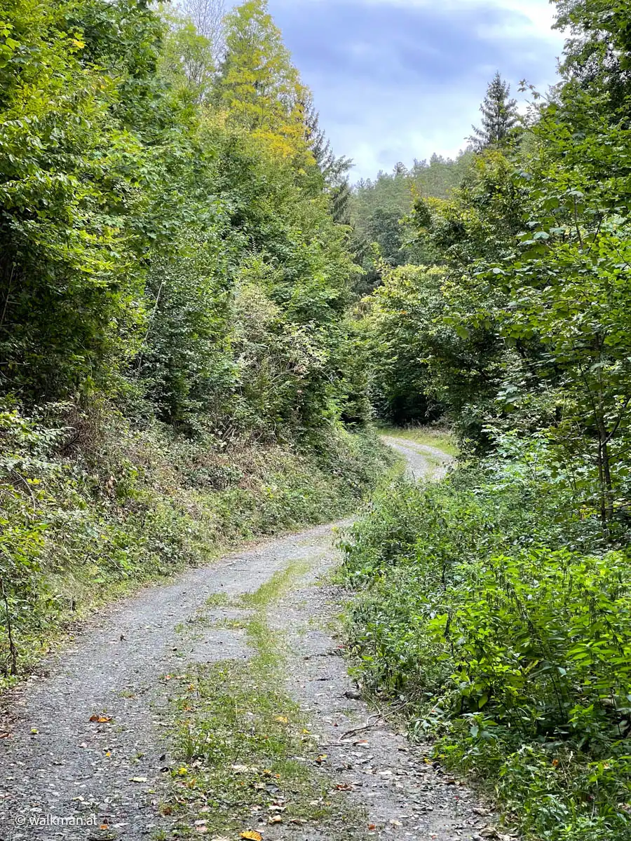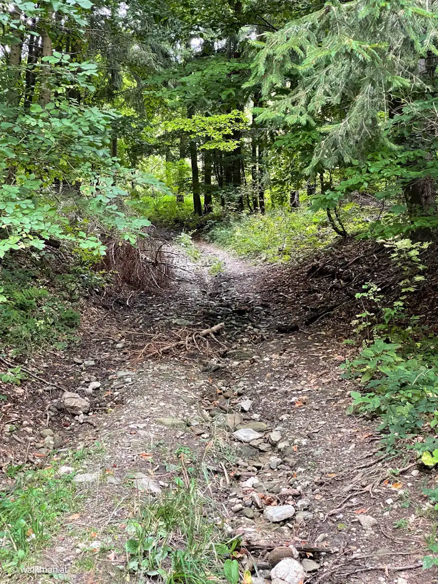 Ich bin mich einmal vergangen und dann, zwei Kilometer später, wieder links abgebogen, um auf die Route zurückzukommen. Meine Route führte bei diesem Abschnitt eben halbhoch am Kamm durch den Wald, anstatt – wie vorgesehen – am Bach entlang. Sei‘s drum, angenehm zu gehen, war es jedenfalls.