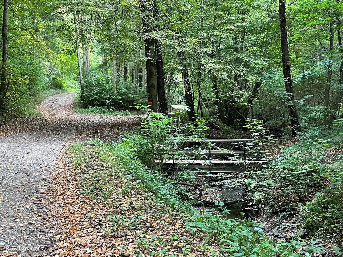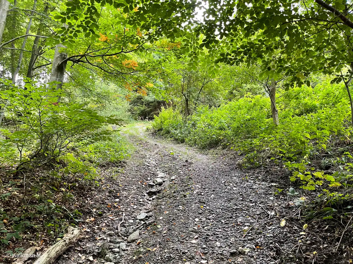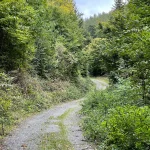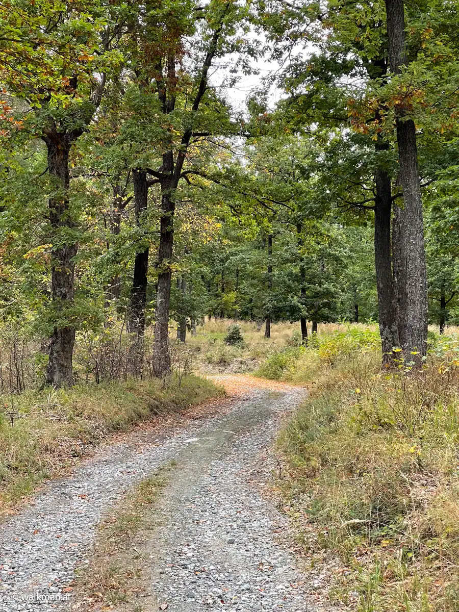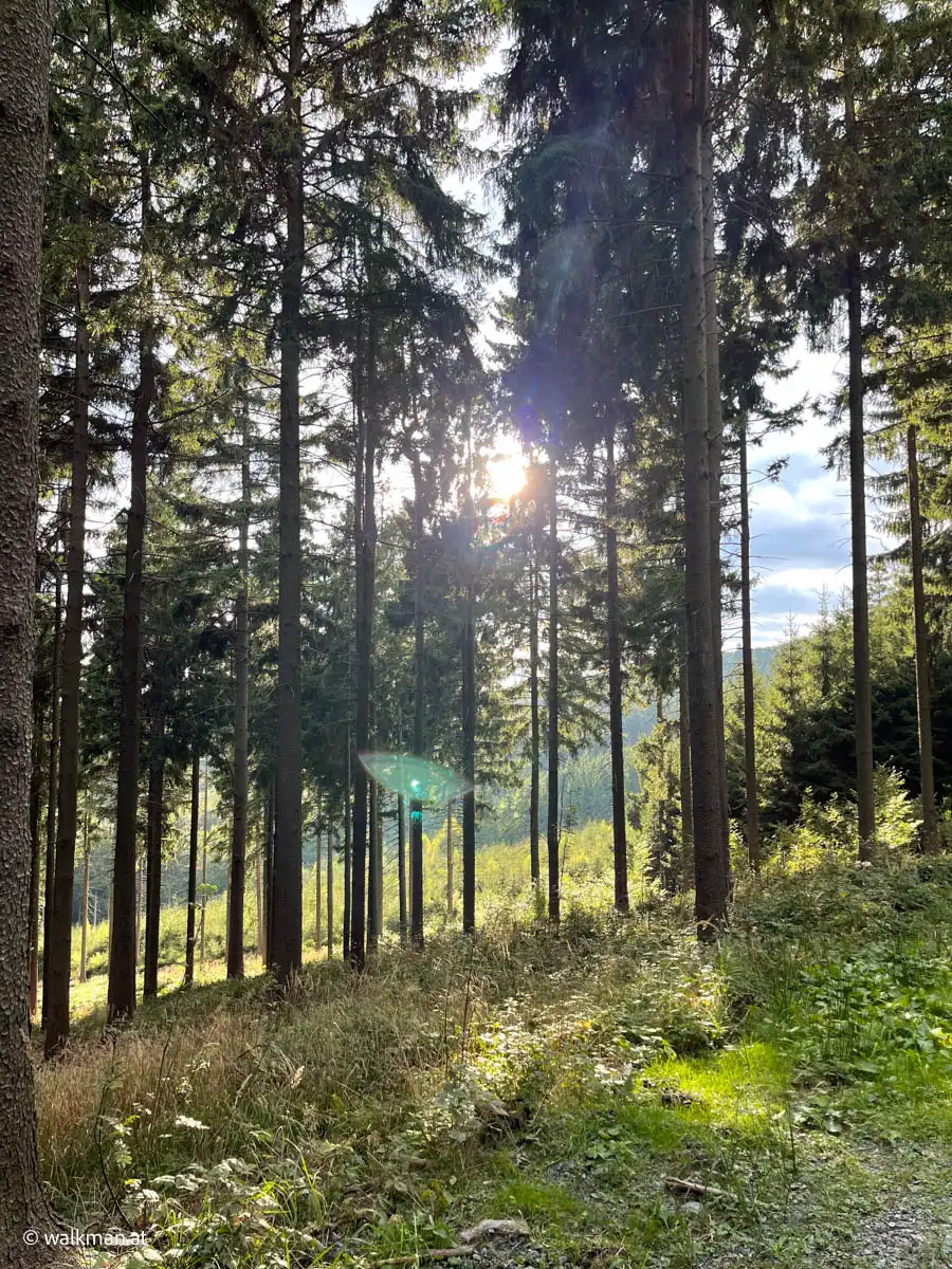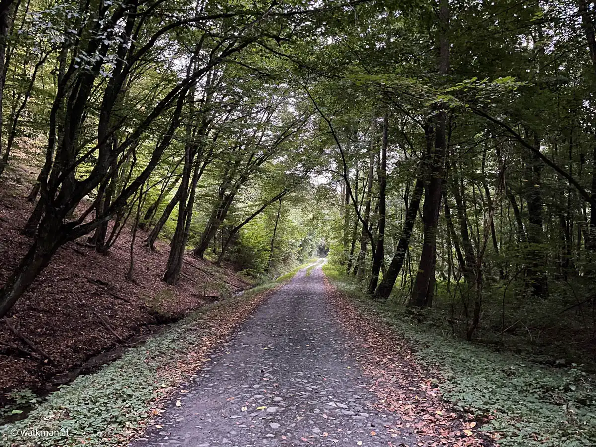 Ich bin mich einmal vergangen und dann, zwei Kilometer später, wieder links abgebogen, um auf die Route zurückzukommen. Meine Route führte bei diesem Abschnitt eben halbhoch am Kamm durch den Wald, anstatt – wie vorgesehen – am Bach entlang. Sei‘s drum, angenehm zu gehen, war es jedenfalls.