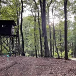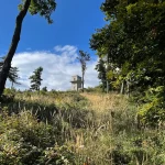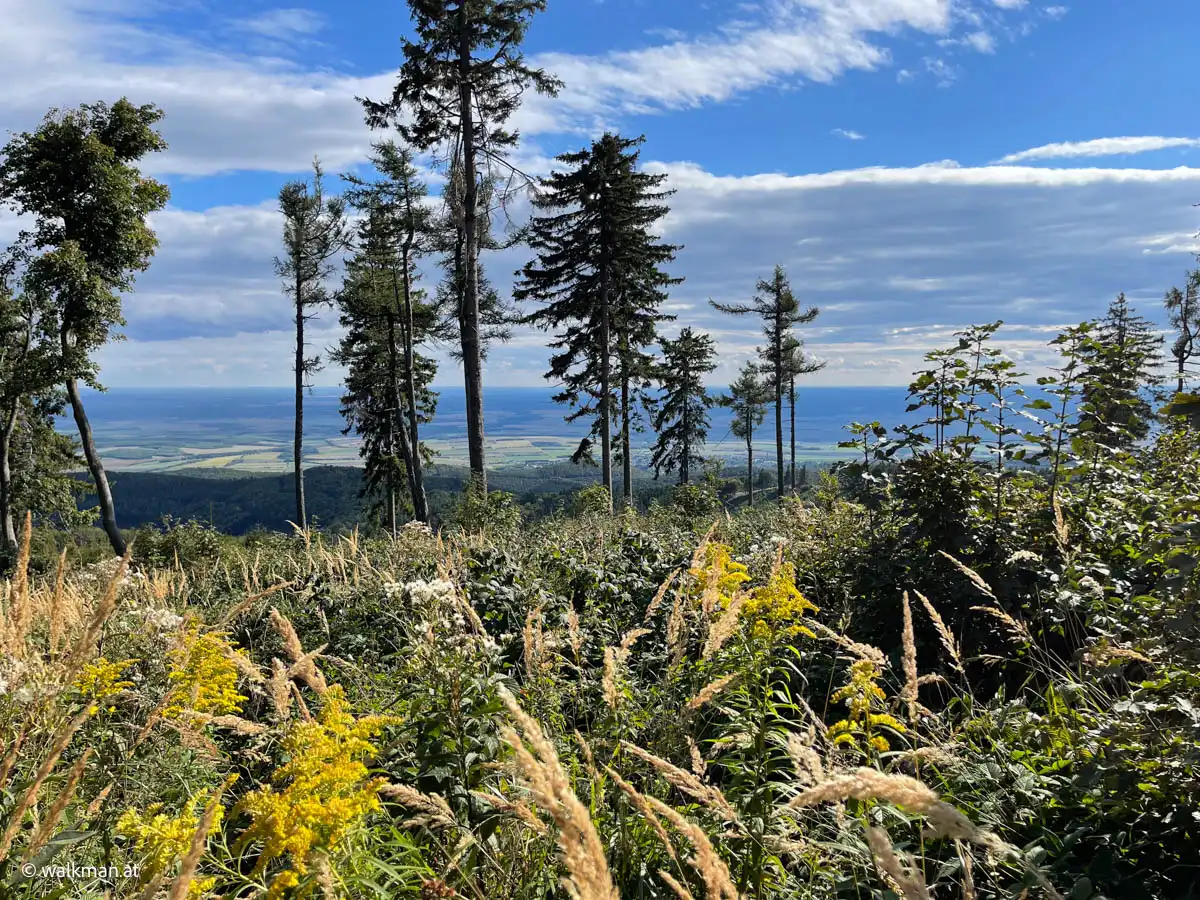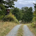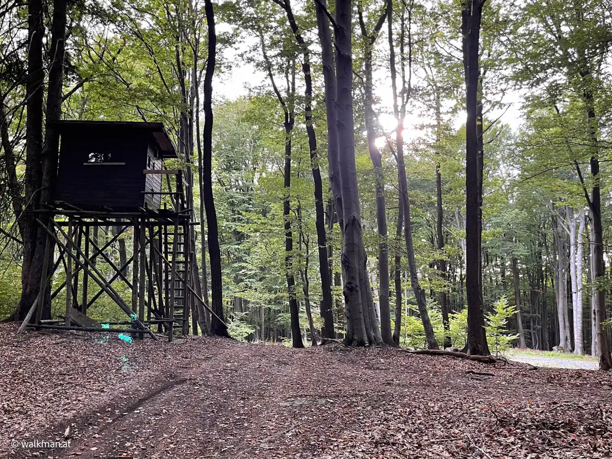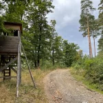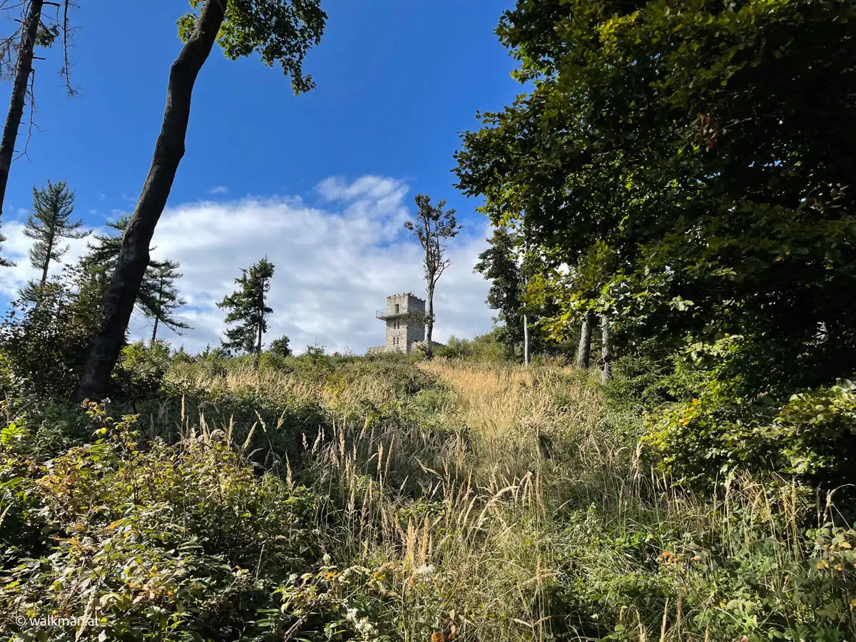 Meine Nase witterte den unverkennbaren Geruch von Wildschweinen, die sich offensichtlich in meiner unmittelbaren Nähe aufhalten mussten. Also kämpfte ich mich durch das Gebüsch. Zwischen hohem Gras und Brombeerstauden hindurch. Schritt für Schritt. Meter für Meter. Nun gab es kein Zurück mehr. Aber es war so wie am Handy angegeben. Nicht allzu lange später konnte ich, übers hohe Gras hinweg, bereits den Aussichtsturm erkennen. Juhu!