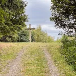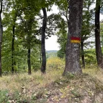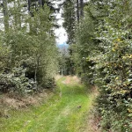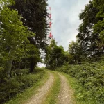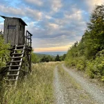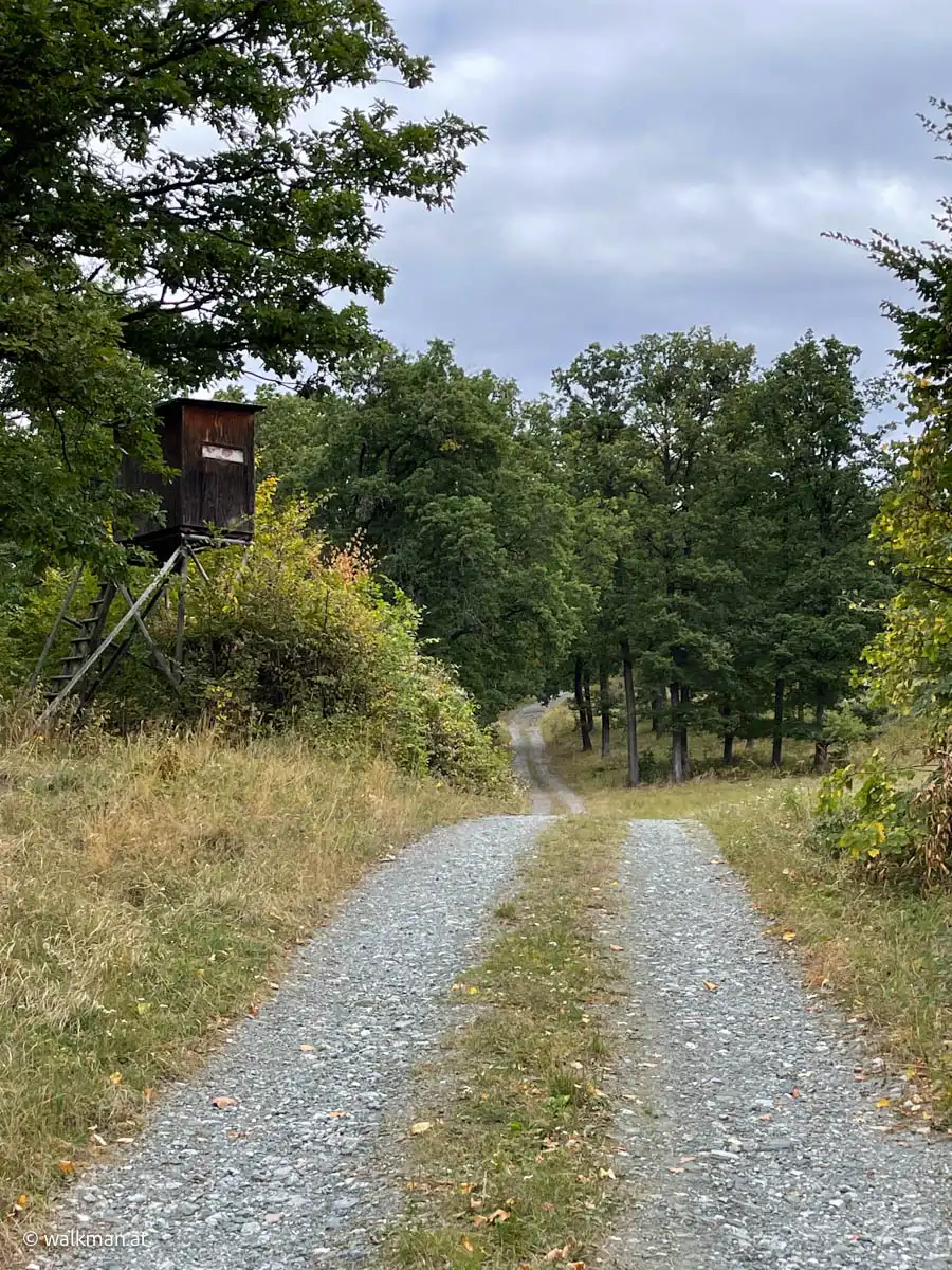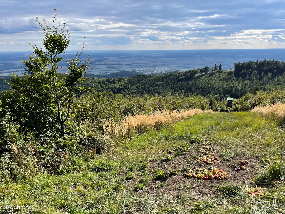 Etwa 100 Meter nach diesem Fotopunkt und nach der Kehre sah ich einen Feldweg rauf gehen Richtung Gipfel. Dieser war zwar nicht auf der Karte verzeichnet, aber zu verlockend, um ihn nicht zu gehen. Also den Feldweg rein und steil bergauf zum begehrten Etappenziel. Dachte ich mir. War dann aber nicht so. Nach einigen Metern erblickte ich eine Menge Äpfel am Boden liegend. Und etwas davon entfernt einen Hochsitz. Der ehemalige Bauernbub in mir kombinierte schnell mit dem Ergebnis: Wildschweine. Hier ist ein Futterplatz. Ups. Also schnell den Weg weiter. Aber … was für einen Weg? Die bis hier klar ersichtlichen Spuren von Geländewagen und Co. verschwanden im Nirgendwo, reduzierten sich zu einem Trampelpfad. Der aber sichtlich nicht von Menschen stammte. Wieder „Ups“. Was nun?