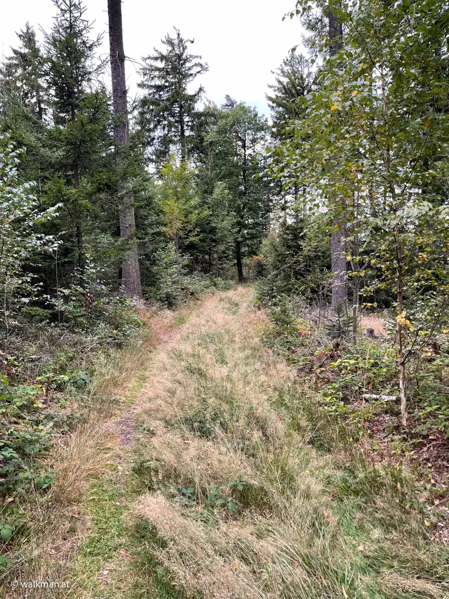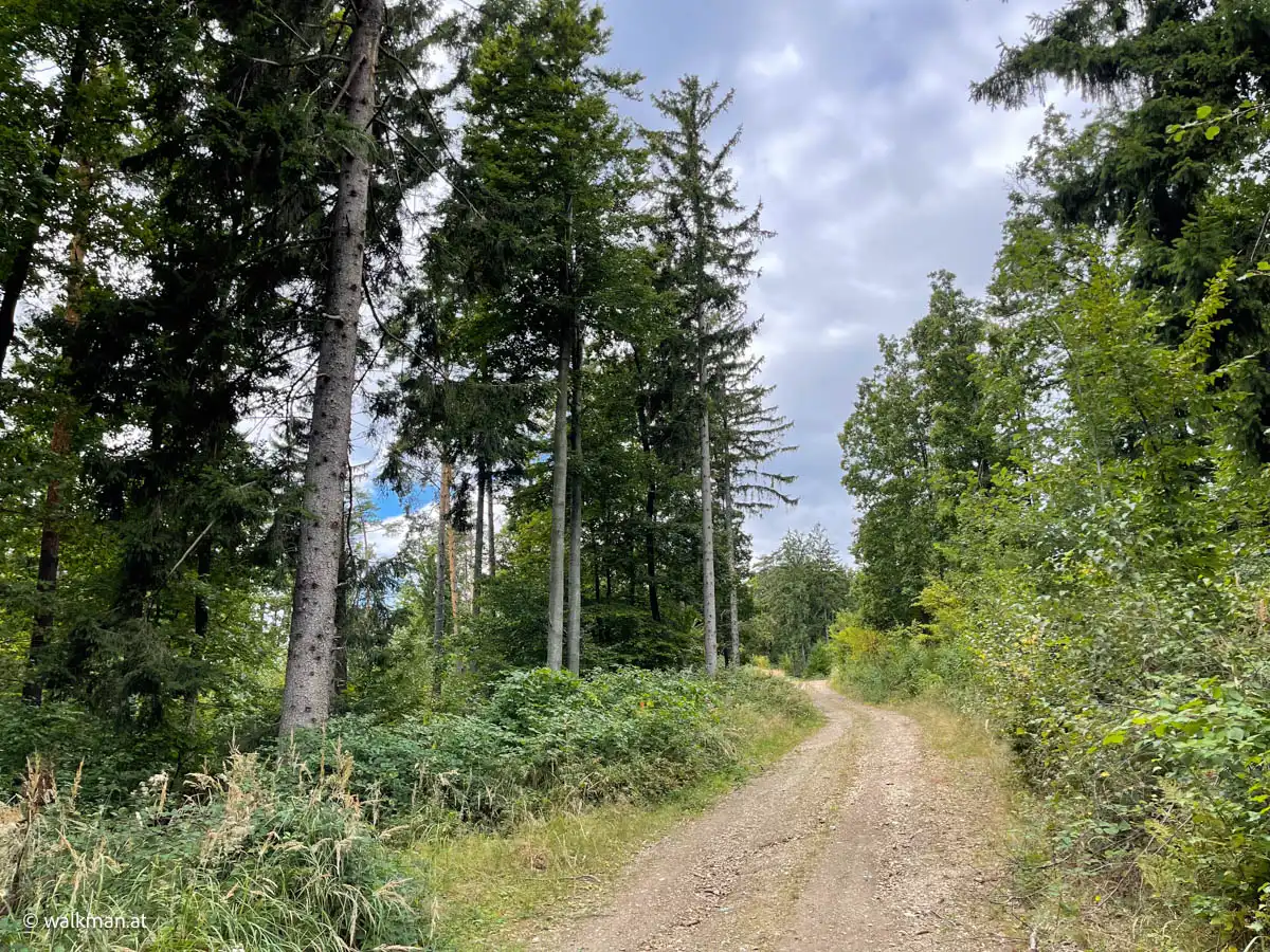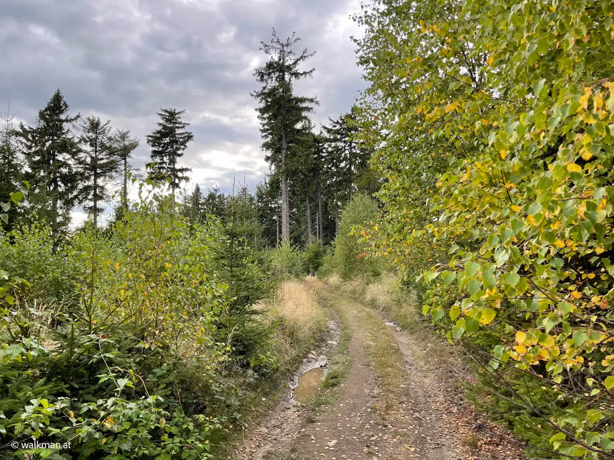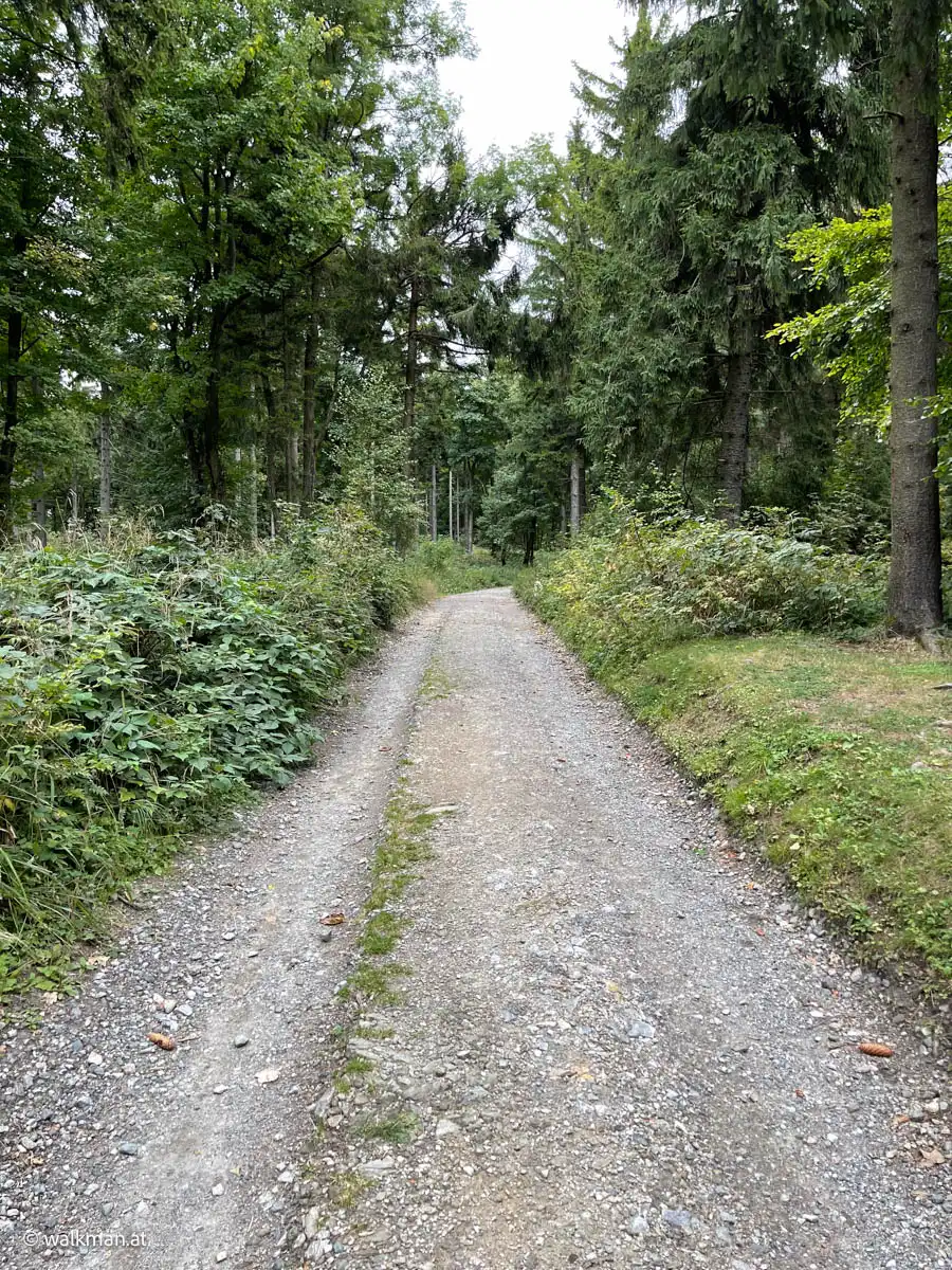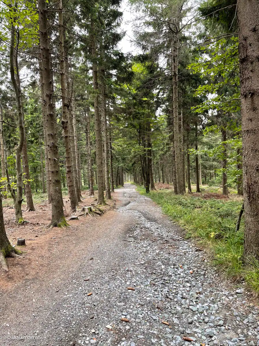 Die Route führt nun auf angenehmen, weitgehend ebenen Waldwegen durch das Geschriebensteinmassiv. Mir sind hier zwei besonders schnelle Mountainbiker und eine sichtlich gut gelaunte Familie begegnet, ansonsten war ich ganz alleine mit mir und den unendlich vielen Bäumen.