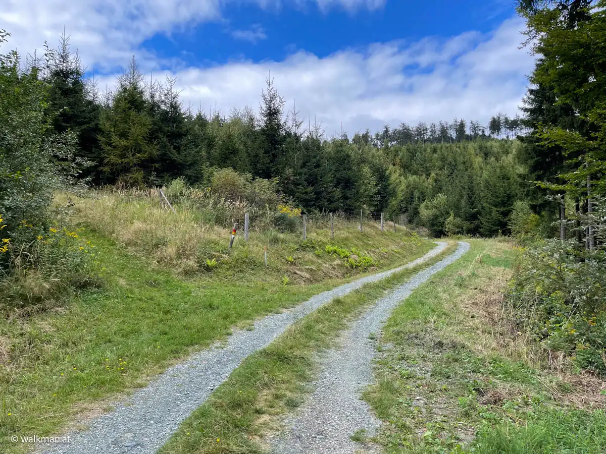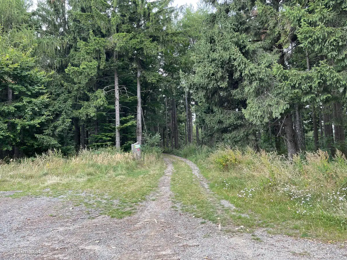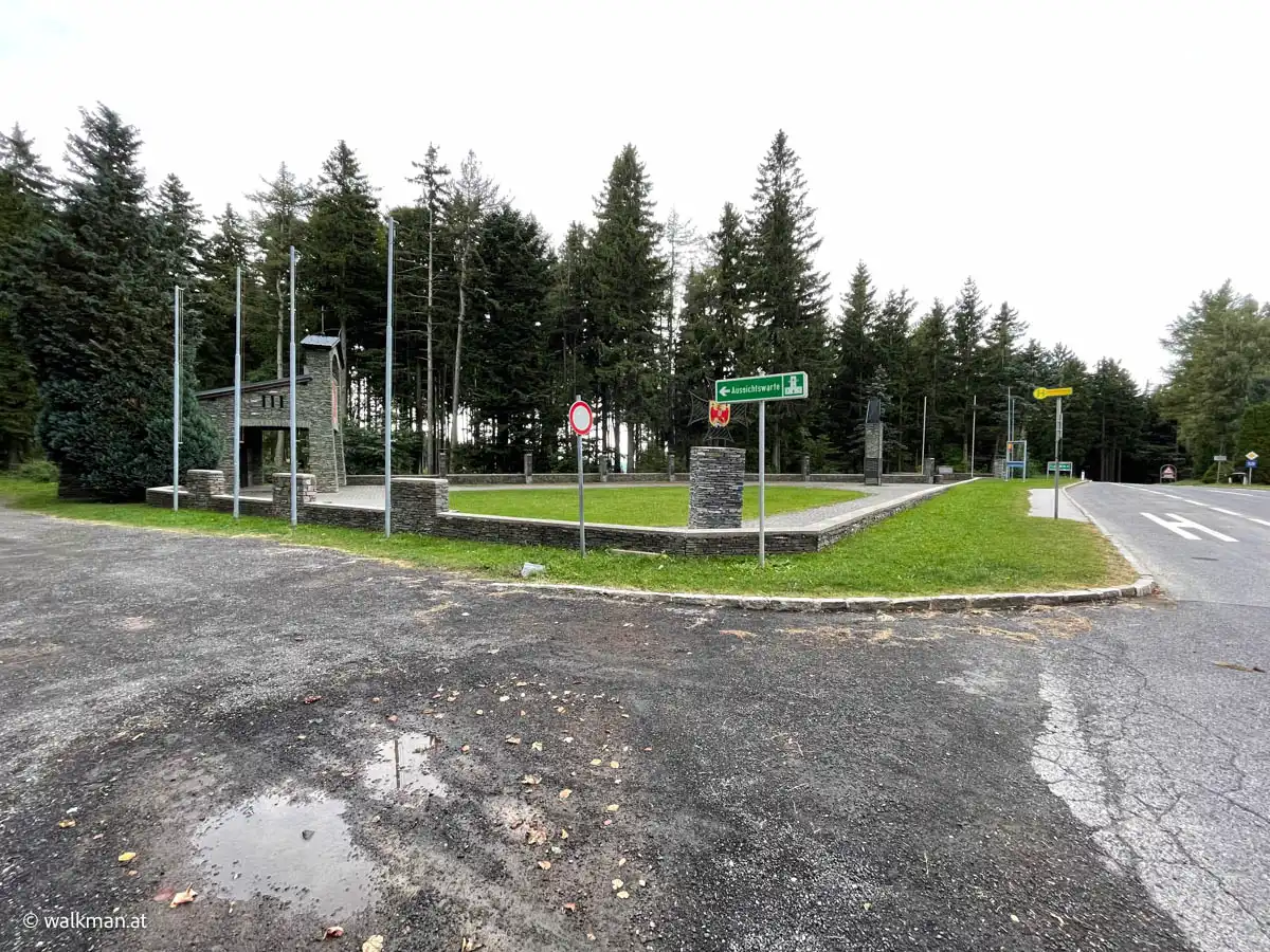 Und dennoch war das ja heute nur ein Etappenziel. Auch der zweite Gipfel am Geschriebensteinmassiv wollte noch besucht werden. Der Hirschenstein. Also ging es nach diesem ersten Erfolgserlebnis wieder weiter. Die Wegstrecke zum, bereits erwähnten, Parkplatz an der Bundesstraße bei der Passhöhe ist angenehm und relativ eben.