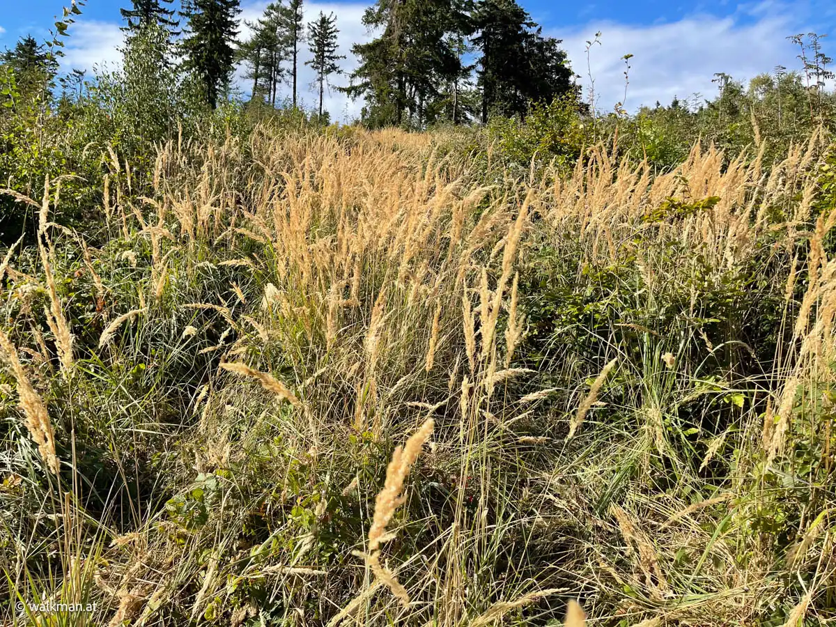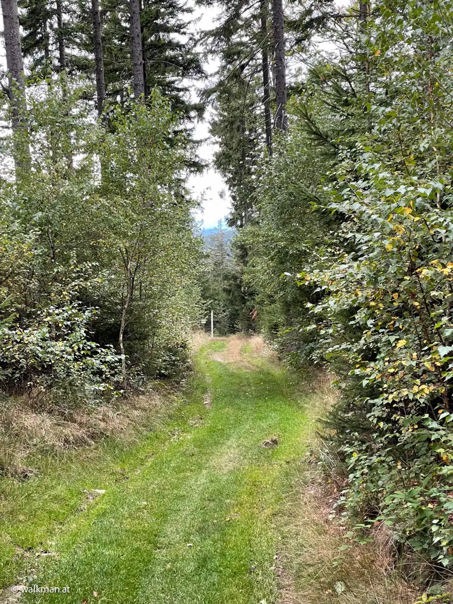 Den ganzen Weg, also geschätzte 40-50 Höhenmeter wieder zurück gehen, bis zum Schotterweg? Laut Navi am Handy war es nicht mehr weit zum Gipfel. Oder weiter bergauf, die Luftlinie zum Gipfel, quer durchs Gemüse suchend. Ich entschied mich für Letzteres. Und das schnell.