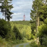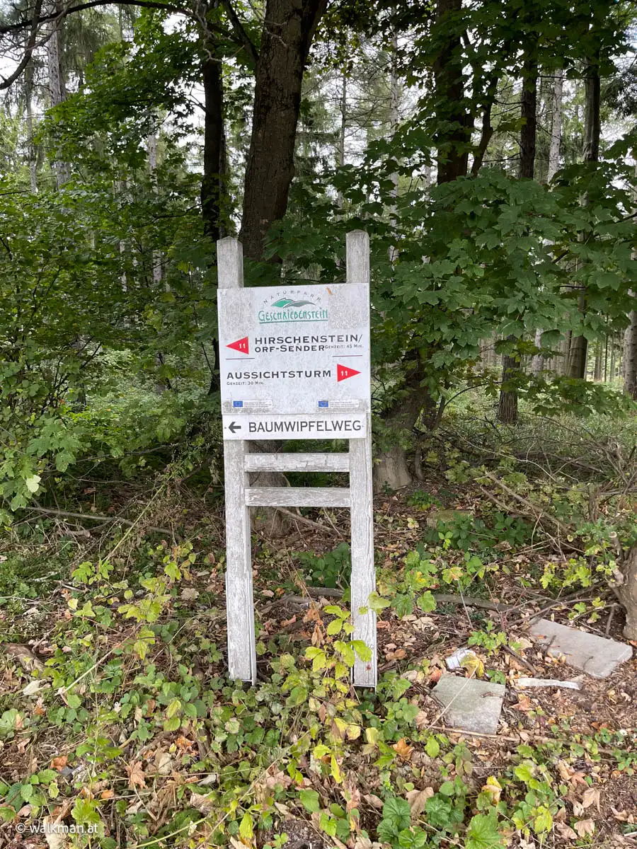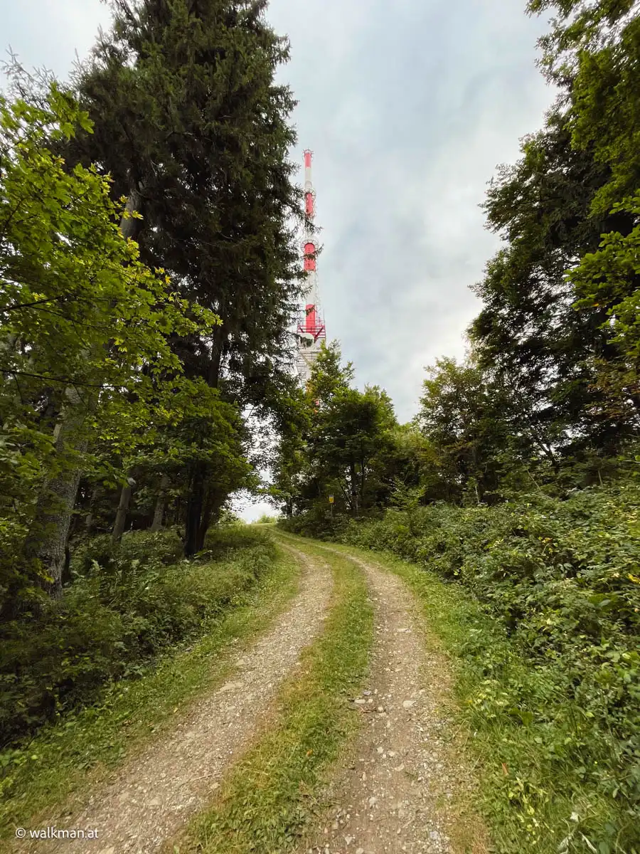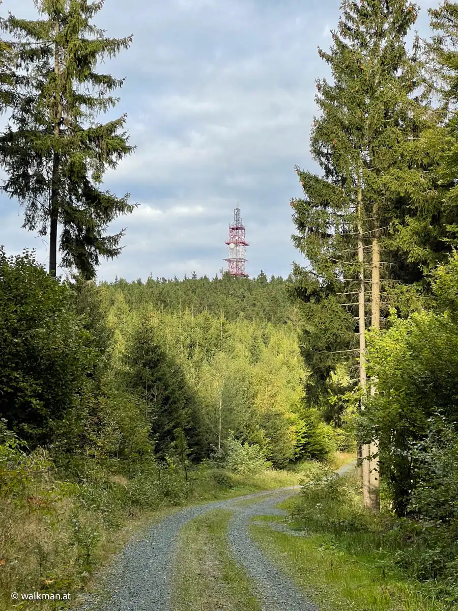 Das letzte Stück zum Hirschenstein ist wieder von der Sorte: steiler ansteigend. Für mich war es mühsam mit einigen Verschnaufpausen. Hatte ich ja nun bereits etwa 15 Kilometer in den Füßen und über 600 Höhenmeter. Und mit diesem Anstieg hatte ich auch nicht gerechnet. Auf der hochoffiziellen, vom Tourismusverband zur Verfügung gestellten Route im Web, führt die Route nicht mal ganz zum Sender, obwohl dieser als Teil der Strecke beschrieben ist. Die biegt bereits beim Kreisverkehr ab, was zur Folge hat das die Höhenmeter, die ich hier nun abstrampelte, nirgendwo vorab zu sehen sind.