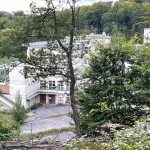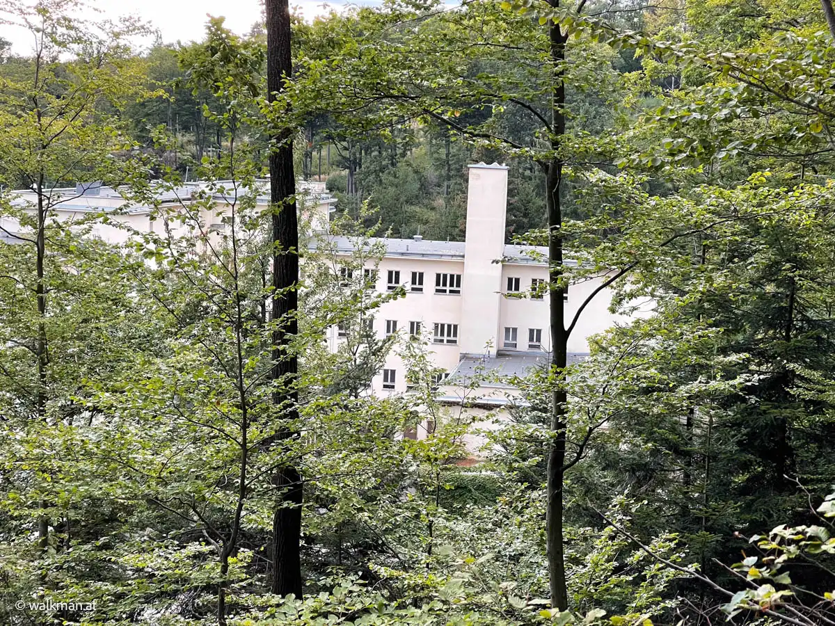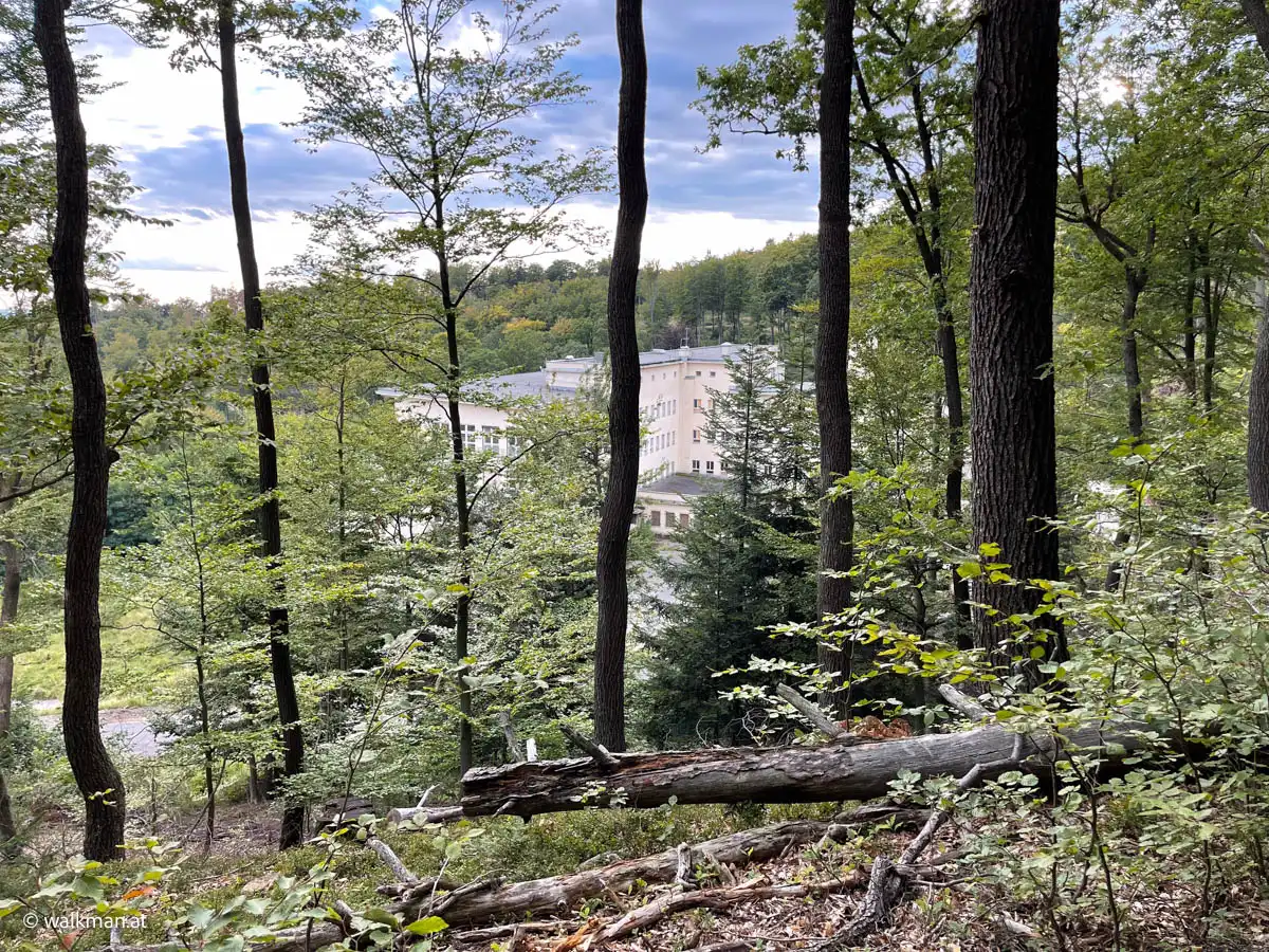 Die Route führt hier nun stetig bergab durch den Wald, auf diesem Wegabschnitt meist auch auf breiten Schotterwegen. Und dann kommt schon das nächste Highlight: Ein Gebäudekomplex mitten im Wald in typischer „Lost Place“ Manier. Die ehemalige Lungenheilanstalt Hirschenstein.