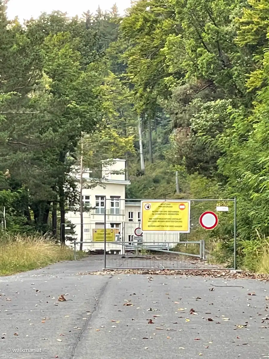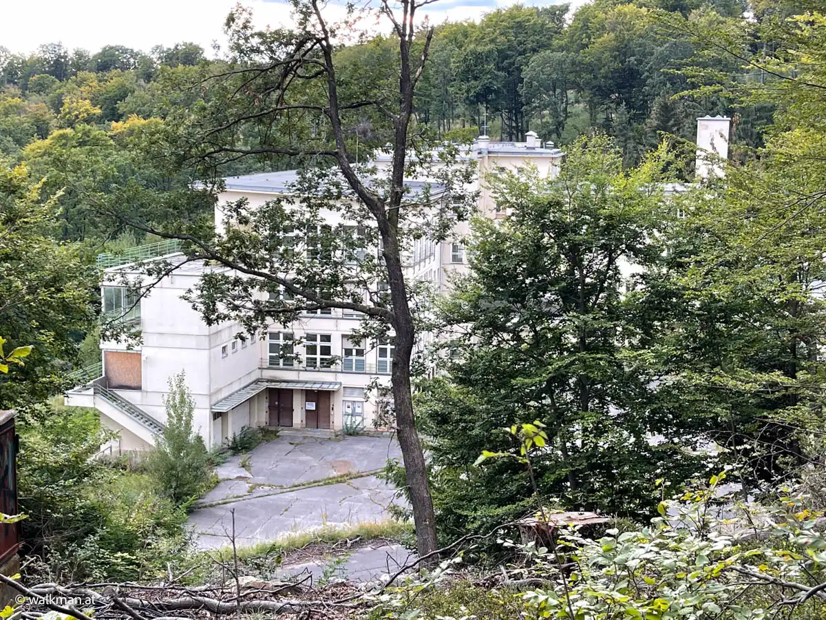 Unheimlich. Das wäre auch ein perfekter Drehort für einen Grusel- oder Horrorfilm. Mitten im Wald verwittert sie vor sich hin. Teils Verwachsen. Vergittere Fenster und verrostete Geländer. Aber irgendwie genial zum Ansehen. Weil betreten darf der Komplex nicht werden. Eine Tafel weist darauf hin: Privatgrund. Betreten verboten. Unter Androhung einer Besitzstörungsklage bei Zuwiderhandlung. Aber Fotos machen geht. Viele Fotos!