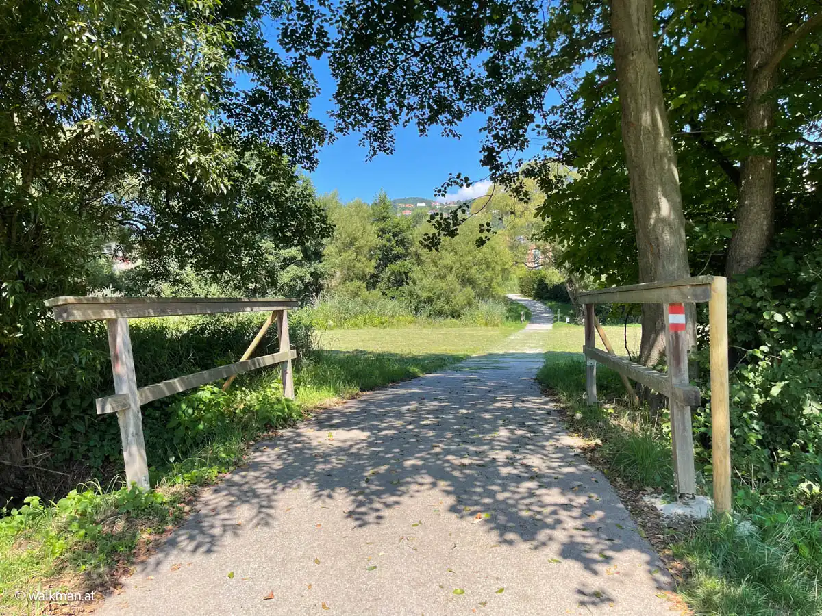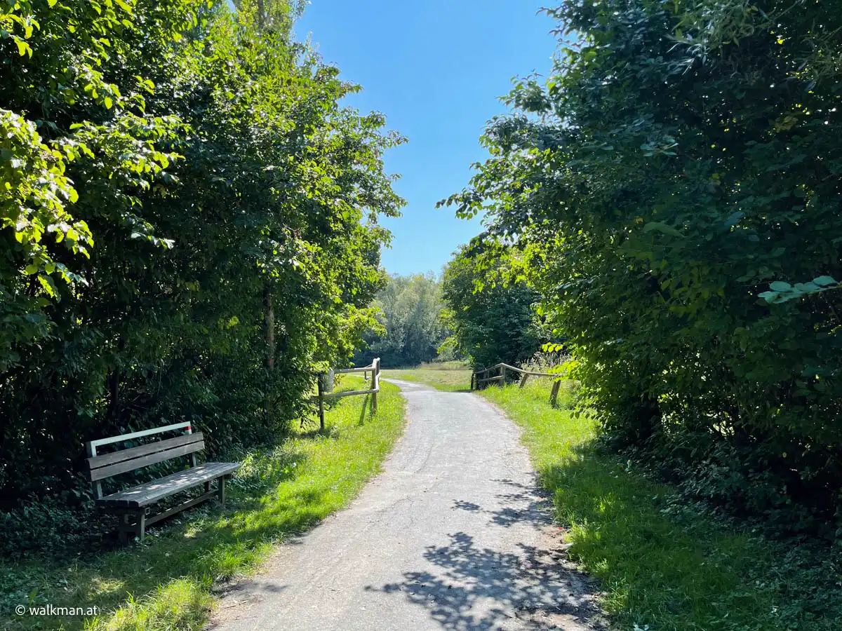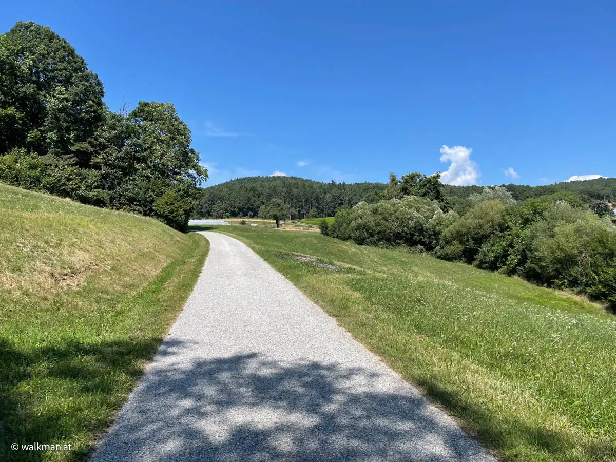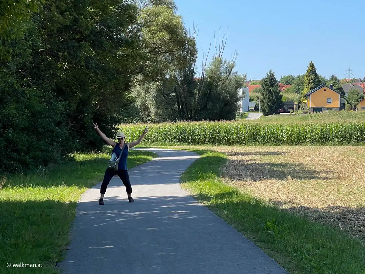 Zunächst führte die auserwählte Strecke durchs Hartberger Gmoos. Tags zuvor hatte ich die Tour im Web, auf meinem favorisierten Online-Tool, abgesteckt. Das Gmoos kannte ich ja bereits von einer anderen Tour. Ein richtig schönes Fleckerl. Die parkähnliche Landschaft mit Fischteichen, einem Bacherl, ein paar Brücken und vielen Bänken ist immer einen gemütlichen Spaziergang wert. Die asphaltierte Runde wäre auch zum Inline-Skaten geeignet. Das muss ich auch mal ausprobieren, hab ich mir bereits fest vorgenommen.