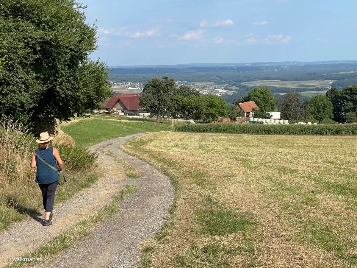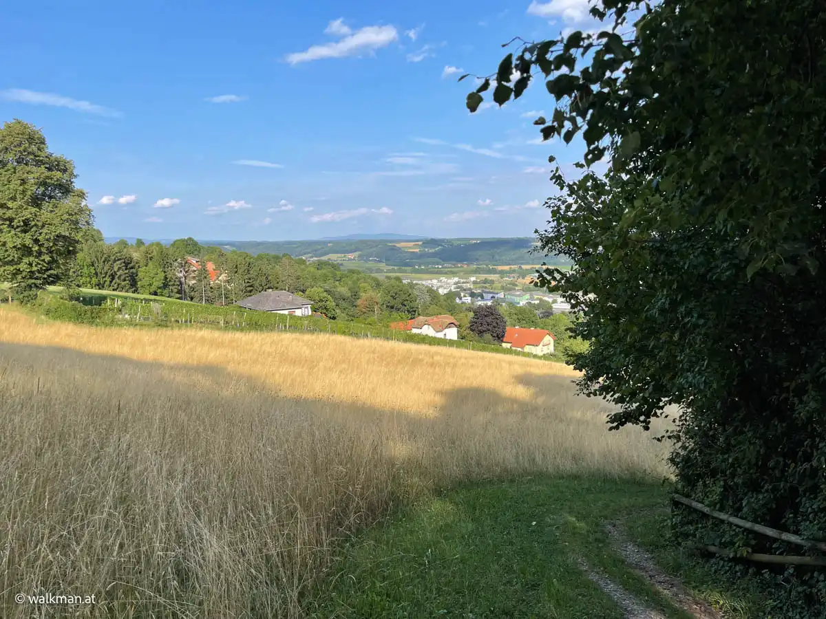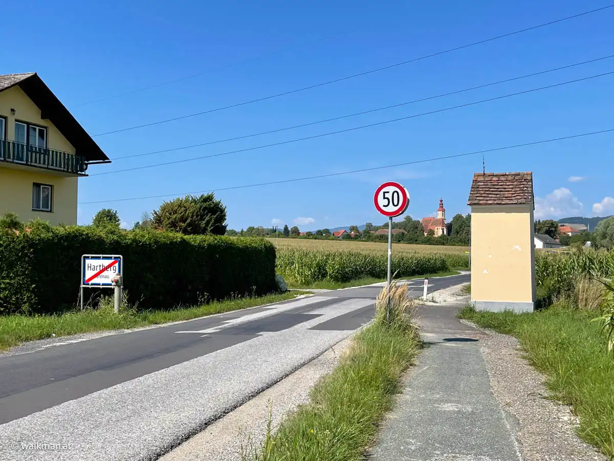 Es sind sicher keine 15 Minuten vergangen, als wir aus dem Wald wieder heraus treten und sich zunächst Wiesen und dann der Ort Hartberg, vor uns im Tal ausbreiten. Hier geht es nun in einem Mix aus Wegen, Wiesen und asphaltierten Straßen runter in die City. Aber immer mit guter Beschilderung.