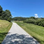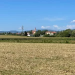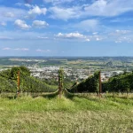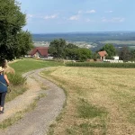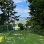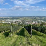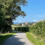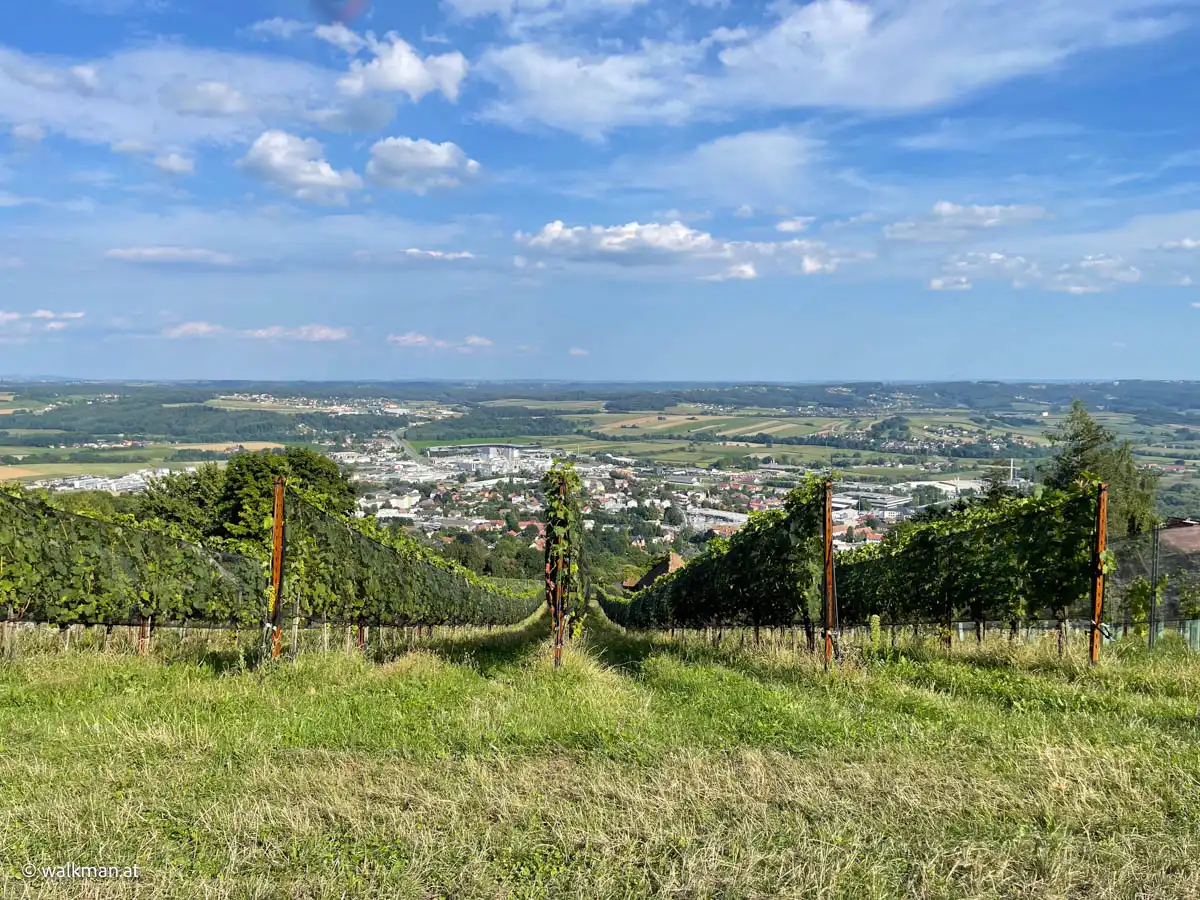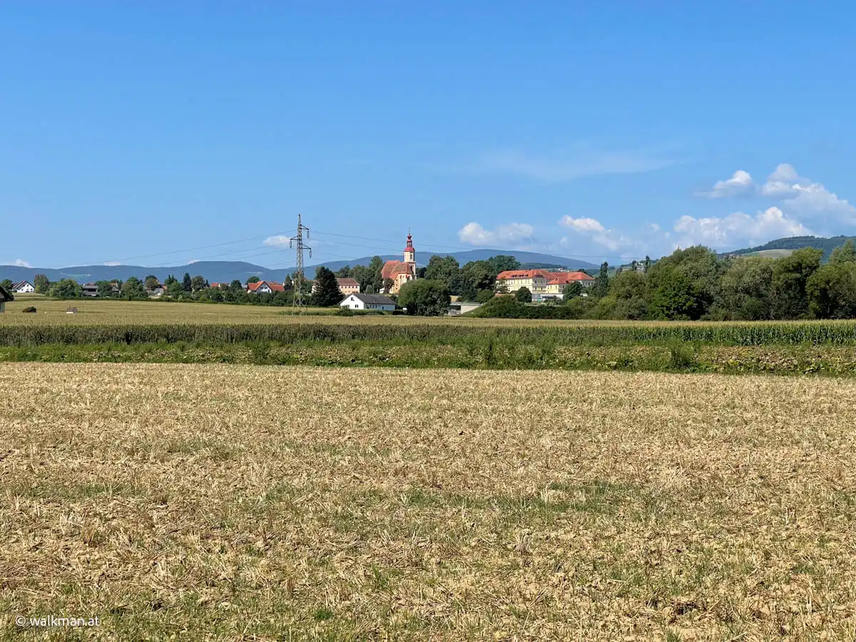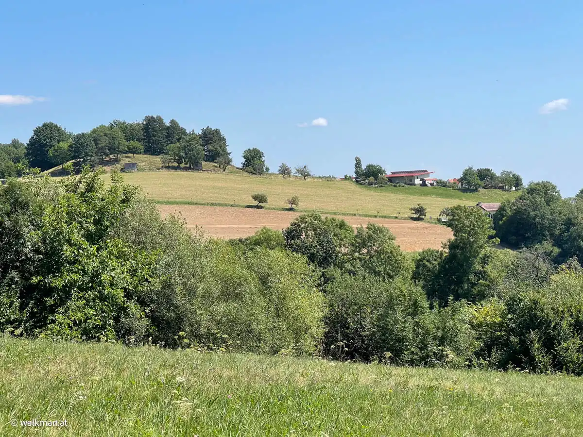 Es sind sicher keine 15 Minuten vergangen, als wir aus dem Wald wieder heraus treten und sich zunächst Wiesen und dann der Ort Hartberg, vor uns im Tal ausbreiten. Hier geht es nun in einem Mix aus Wegen, Wiesen und asphaltierten Straßen runter in die City. Aber immer mit guter Beschilderung.