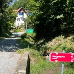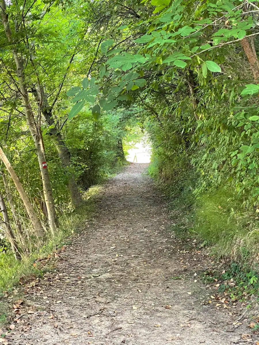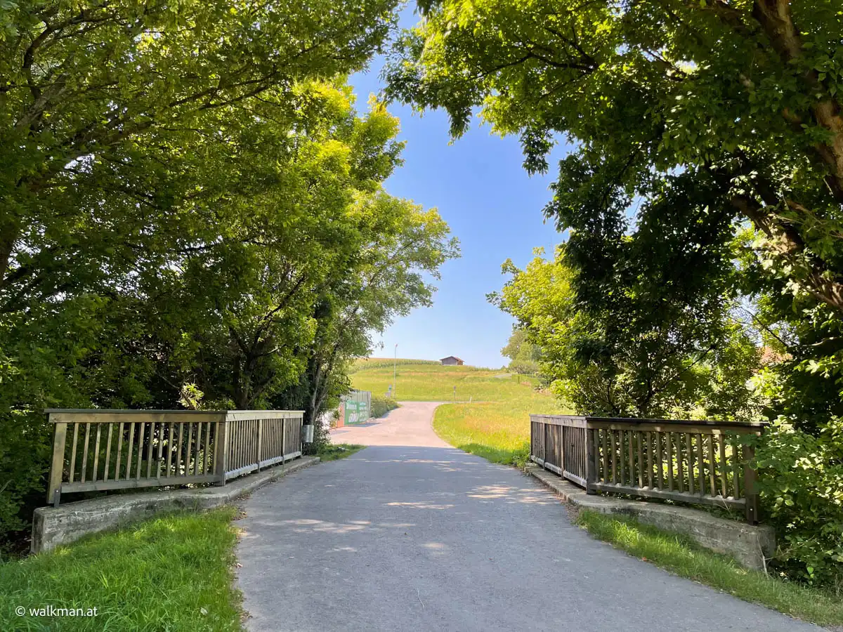 Die Temperaturen heute waren relativ angenehm. 27 Grad um 11:30. Sollte aber, laut Vorhersage, noch auf 30-32 ansteigen. Aber da ich unseren Weg hinauf durch den Wald geplant hatte – den schattigen Brühlweg entlang – sollte das kein Problem darstellen. Hier im Gmoos spürte man die warmen Temperaturen noch gar nicht. Eigentlich war es eher frisch, durchaus angenehm zum Wandern.