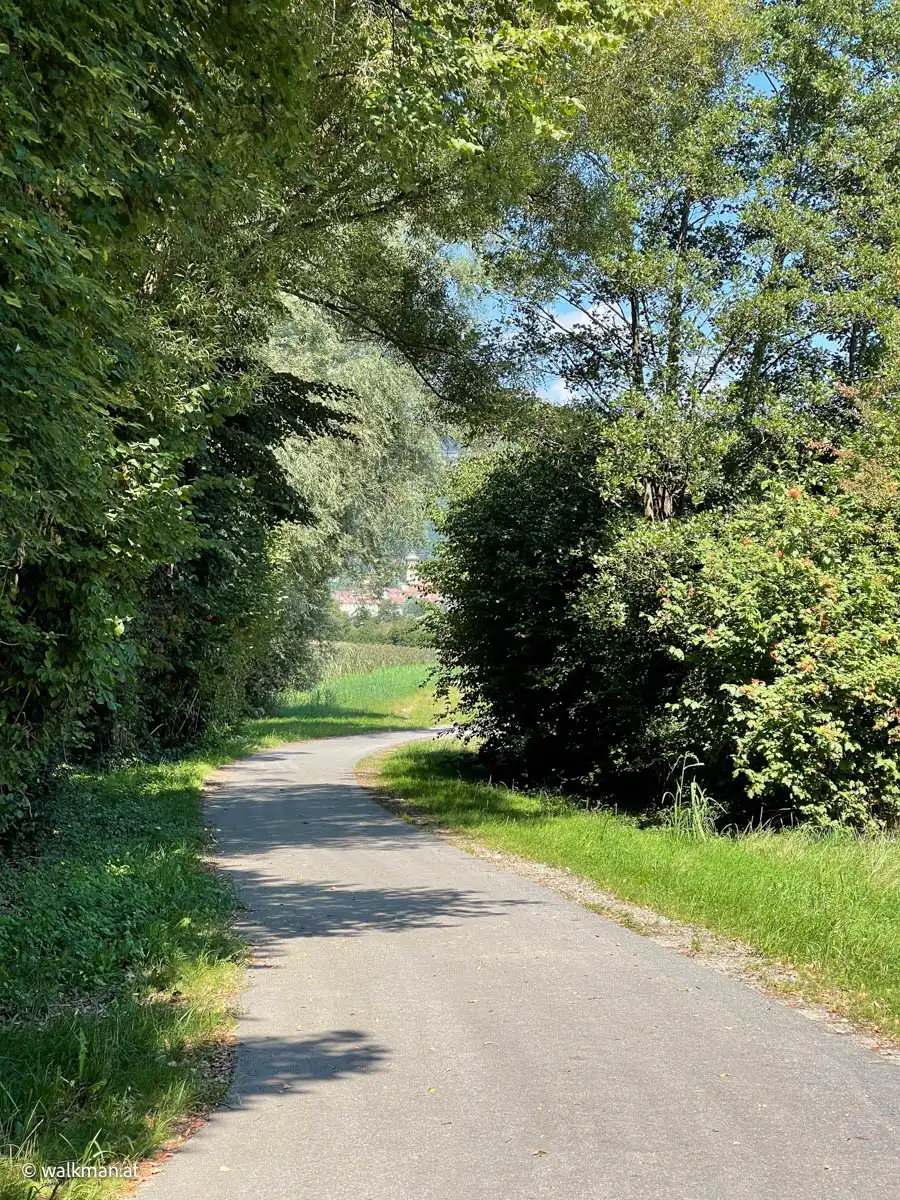 Hier bekamen wir auch den ersten Vorgeschmack auf das, was noch vor uns lag. Gleich nach dem Gmoos beginnt der Anstieg. Langsam, aber stetig. Bergauf. Das spürten wir jetzt bereits in den Wadeln. Und so wie die Steigung, stieg auch die Temperatur langsam, aber stetig. Das spürten wir ebenso. Meine immer wieder stattfindenden kurzen Fotopausen kamen mir da gerade recht.
