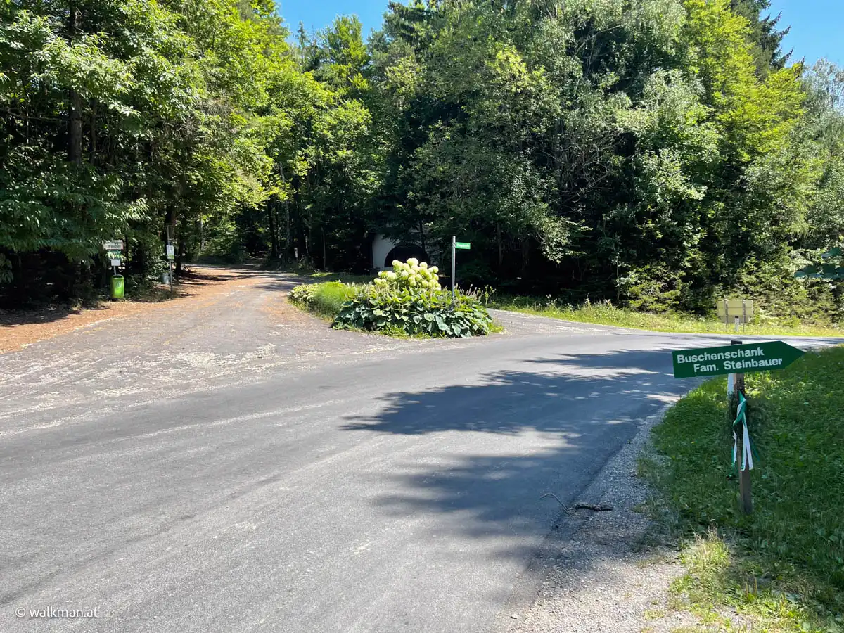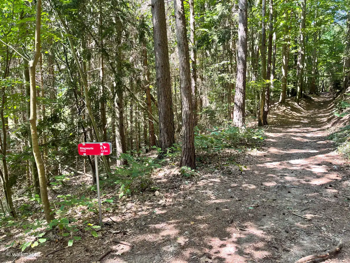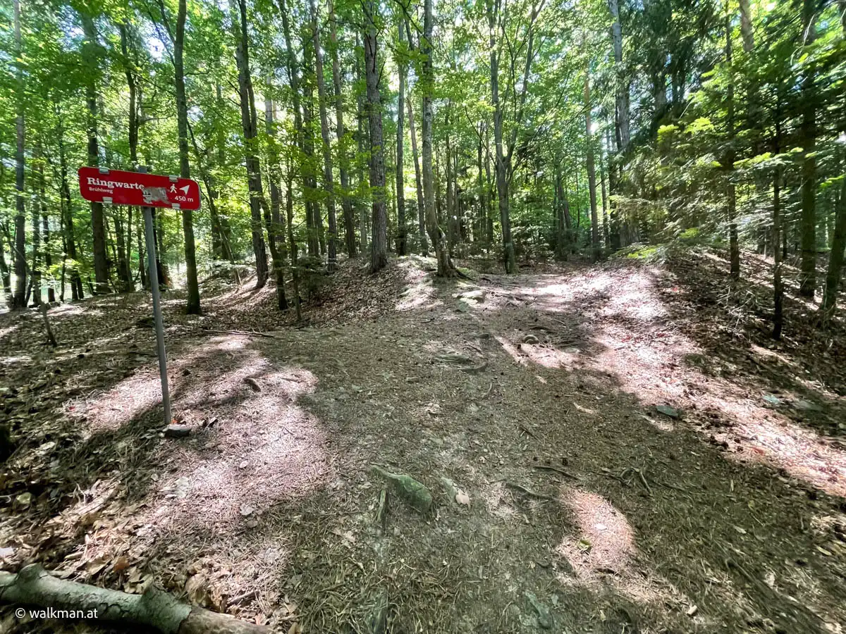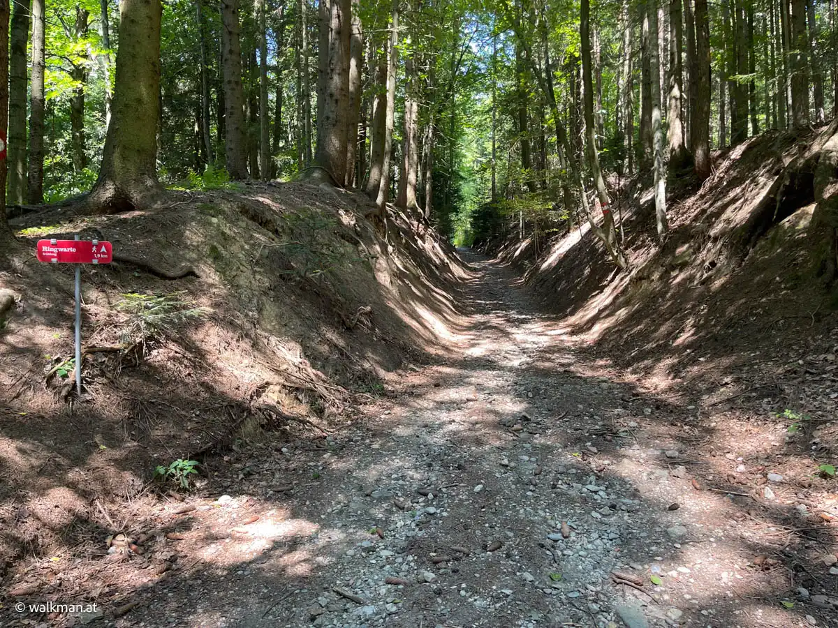 Das ist übrigens der letzte Parkplatz vor der Ringwarte. Bzw. eben jener der zur Warte dazu gehört. Für mobile Besucher. Von hier gibts für Wanderer zwei Möglichkeiten den Weg weiter zu gehen. Die beiden Varianten sind auch mit Hinweisschildern gekennzeichnet. Entweder die Schotterstraße mit gleichbleibender Steigung bergauf. Oder links den Waldweg rein. Eine Zeitlang relativ flach, aber dann, zum Ende hin, stark ansteigend. Wir entscheiden uns für Letzteren.