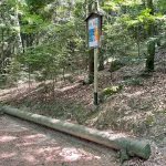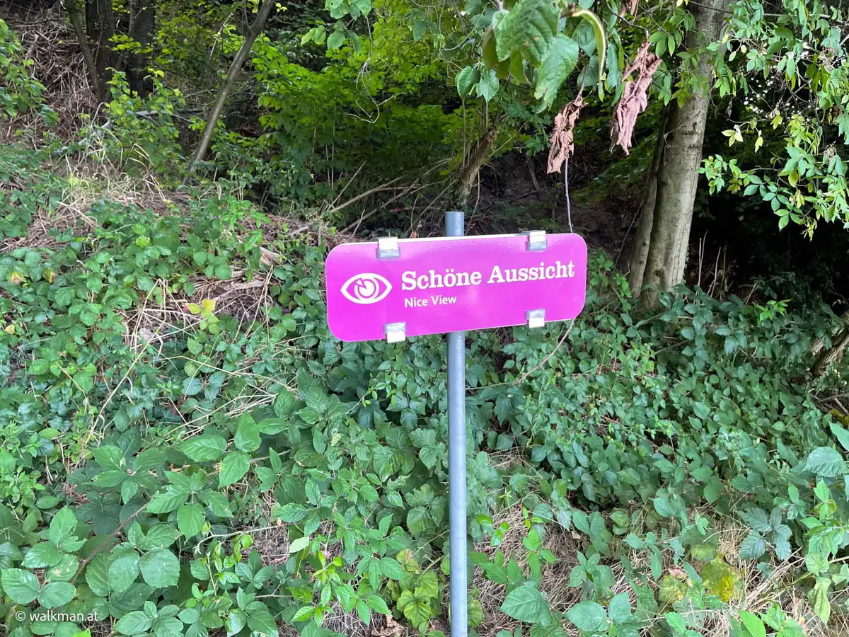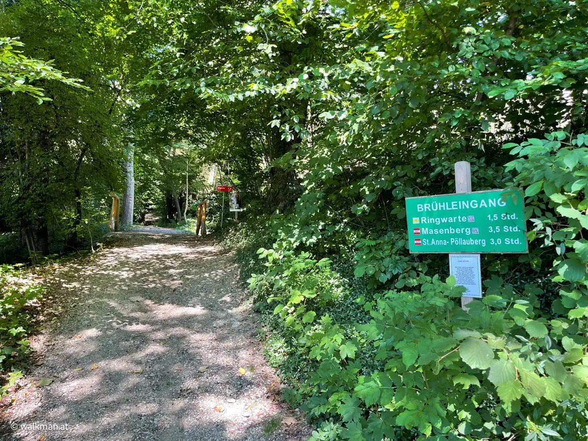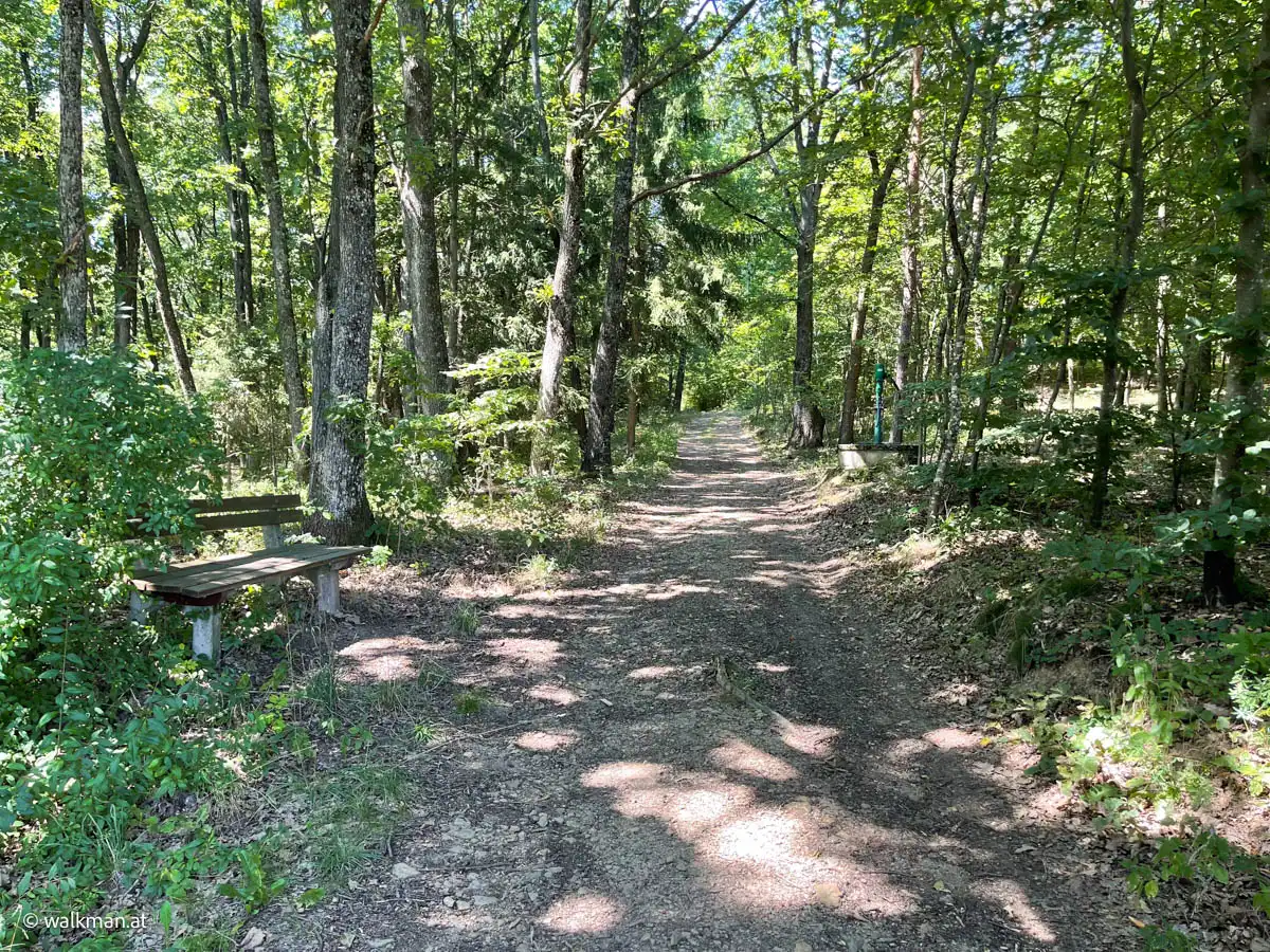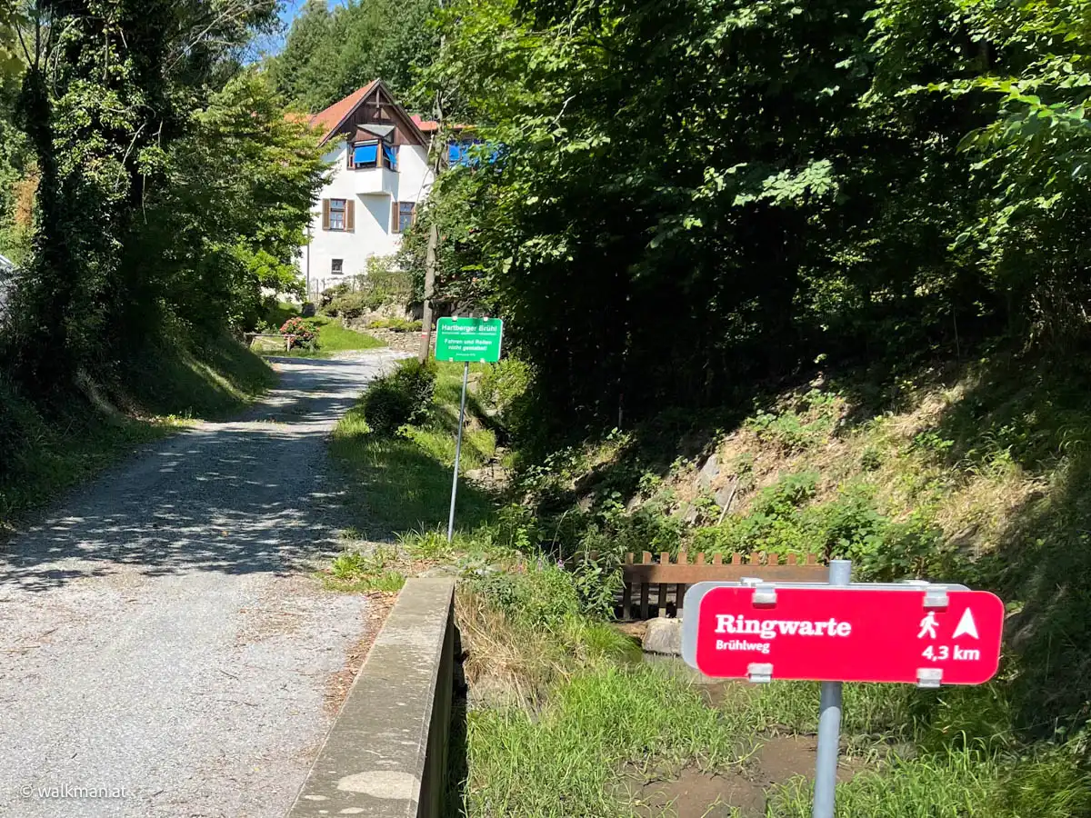 Das ist übrigens der letzte Parkplatz vor der Ringwarte. Bzw. eben jener der zur Warte dazu gehört. Für mobile Besucher. Von hier gibts für Wanderer zwei Möglichkeiten den Weg weiter zu gehen. Die beiden Varianten sind auch mit Hinweisschildern gekennzeichnet. Entweder die Schotterstraße mit gleichbleibender Steigung bergauf. Oder links den Waldweg rein. Eine Zeitlang relativ flach, aber dann, zum Ende hin, stark ansteigend. Wir entscheiden uns für Letzteren.