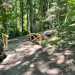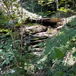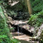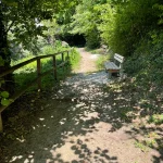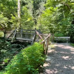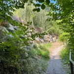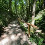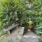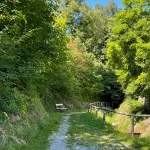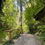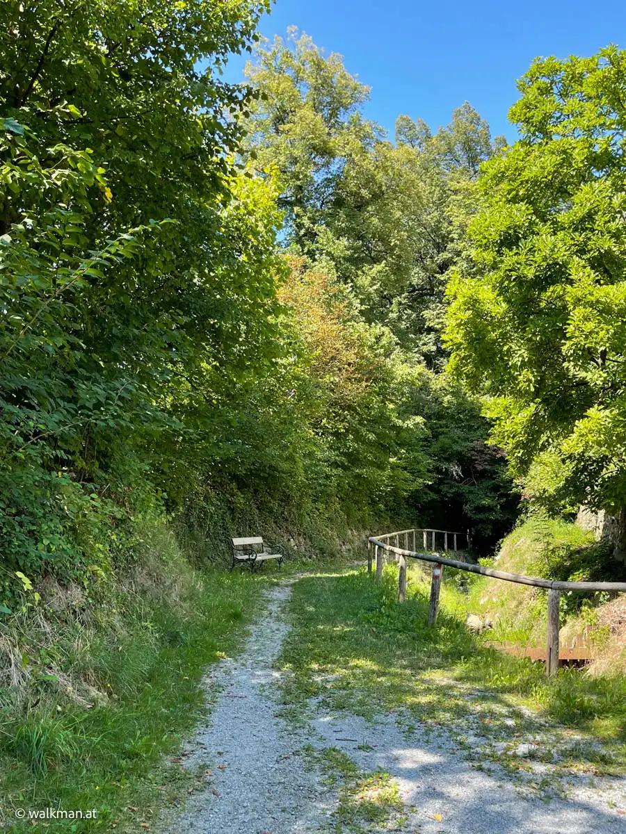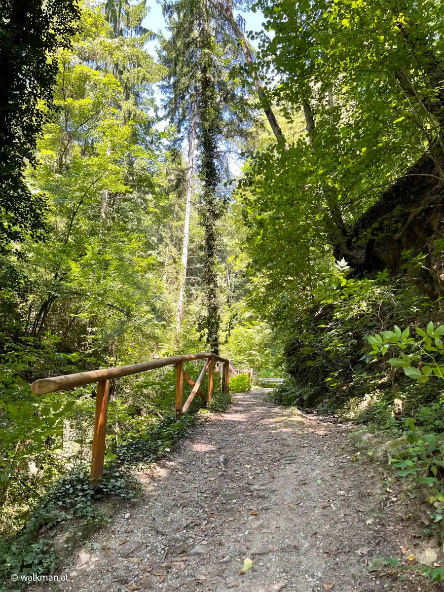 Links und rechts, flankiert von Bäumen und Felswänden, hat dieser Abschnitt eine Art „Schlucht-Charakter“. Eine Klamm eben. Wildschön. Die Luft roch angenehm, nach einer Mischung aus Quellwasser und Moos. Viele Sitzmöglichkeiten zeugen von einer doch regen Wandertätigkeit, die hier gegeben sein musste.
