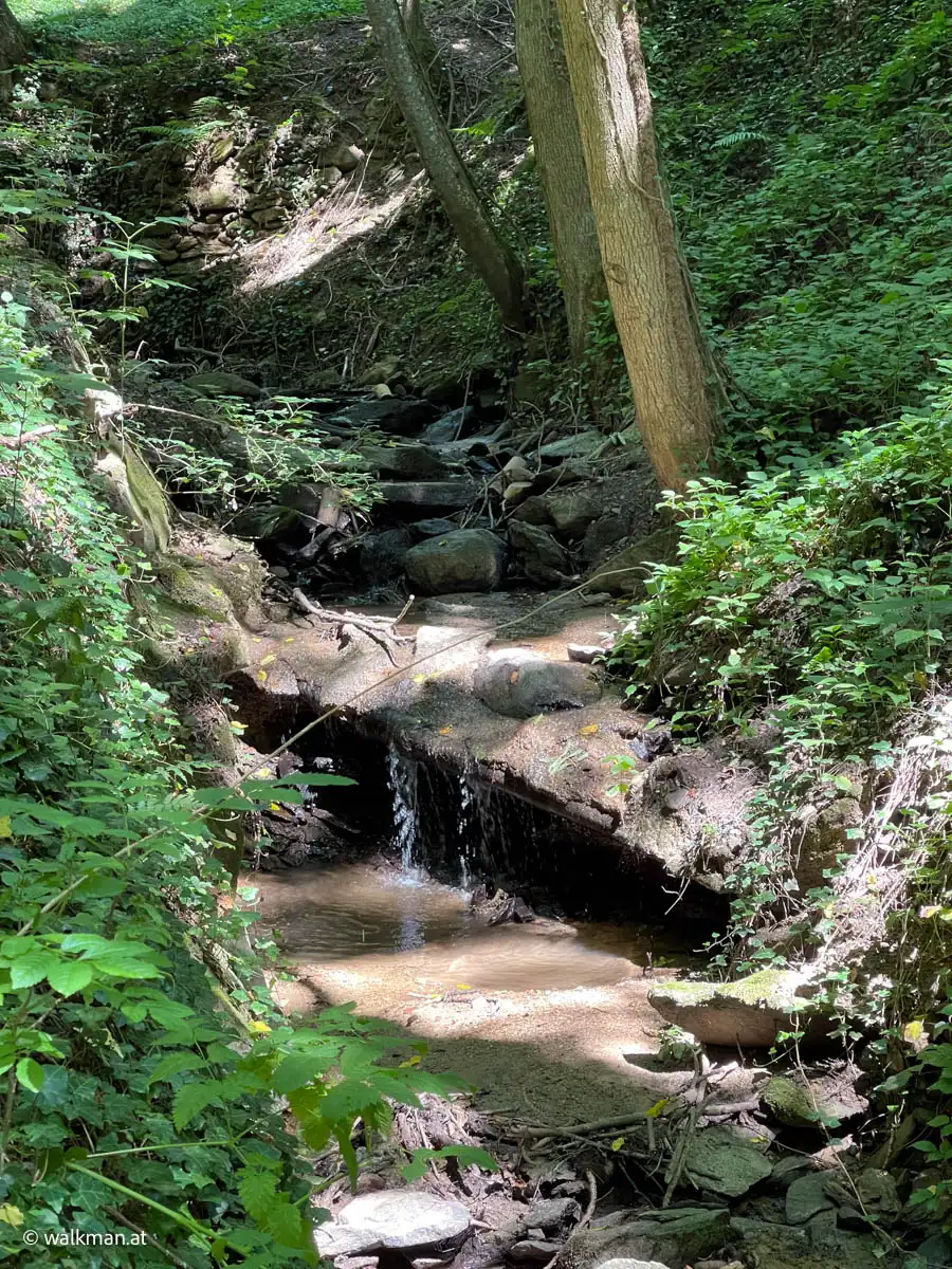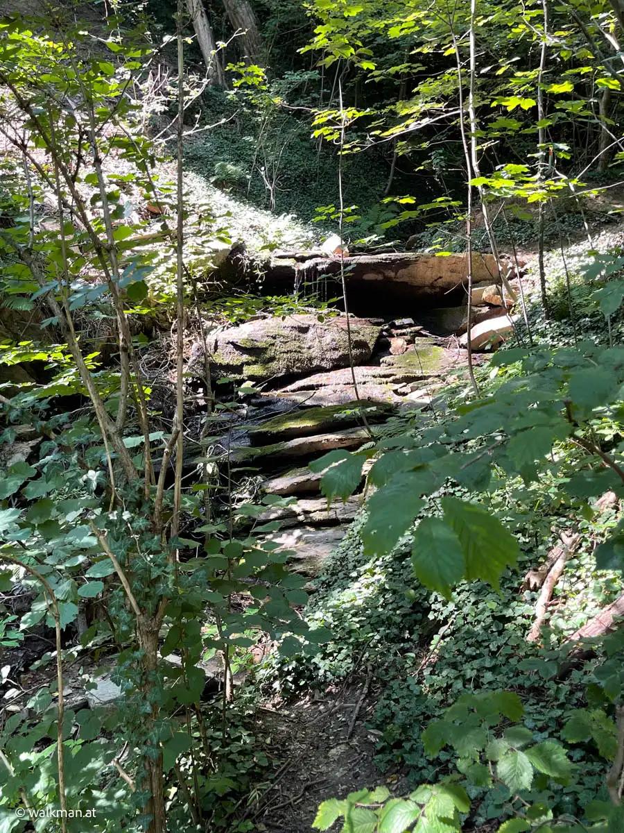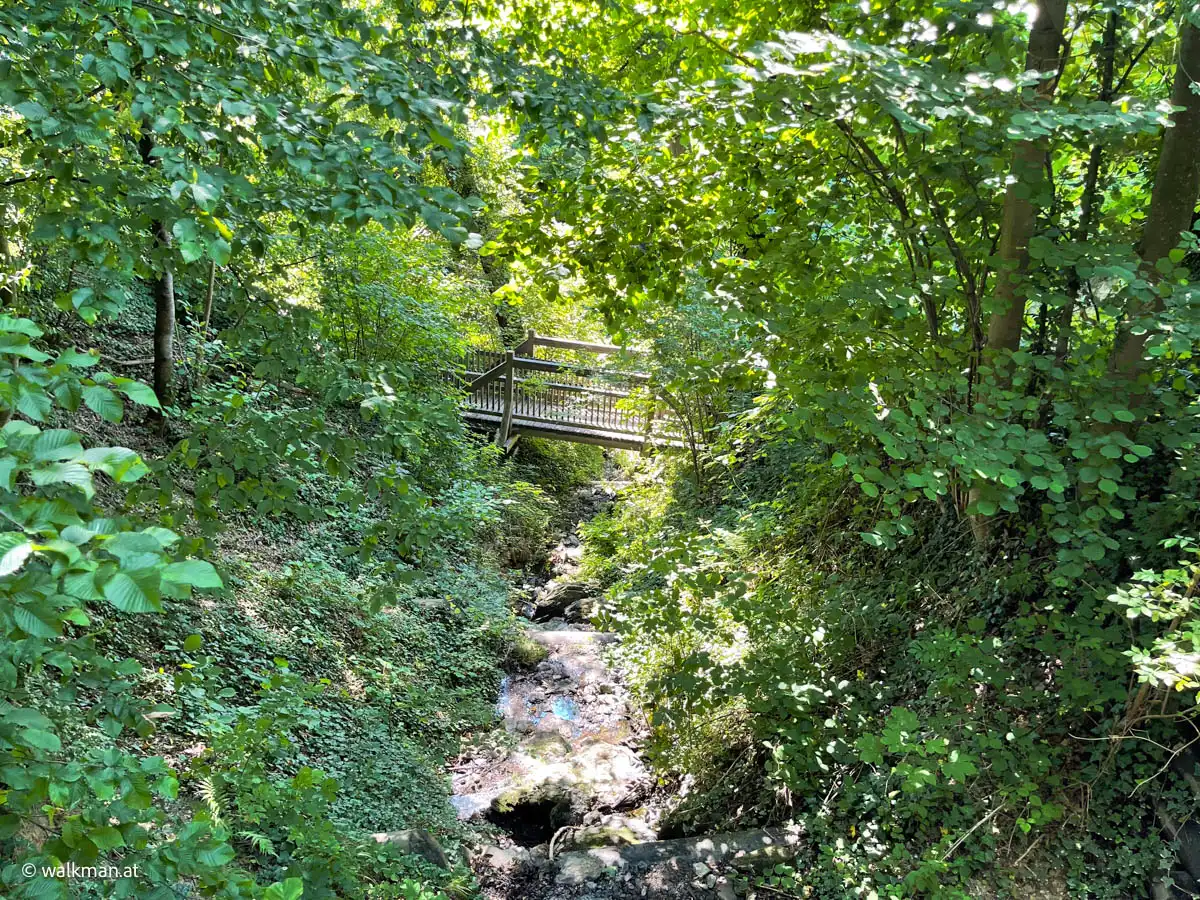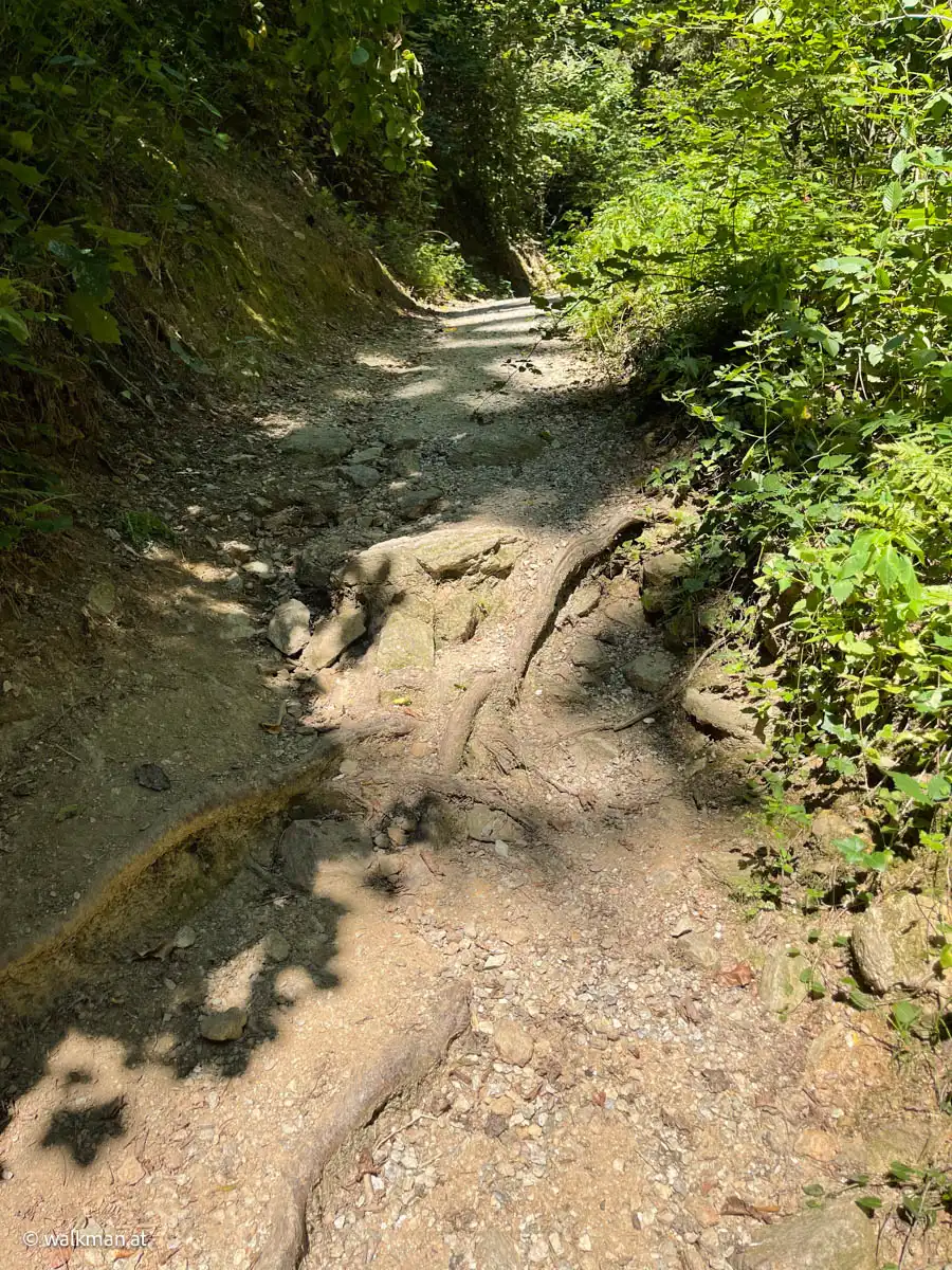 Angenehm. Und schattig. Das war unser erster Eindruck. Der Zweite war: steil und steinig. Über Stock und Stein geht es hier so richtig bergauf. Mitten drinnen ein kleines Bacherl, das bei unserem Aufstieg kaum Wasser führte. Ein kleines Rinnsal ins Tal. Der Weg führt hier mal links, mal rechts neben dem Bacherl rauf. Unterbrochen immer wieder von Brücken, die das Wasser kreuzen.