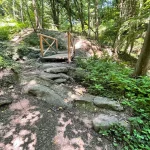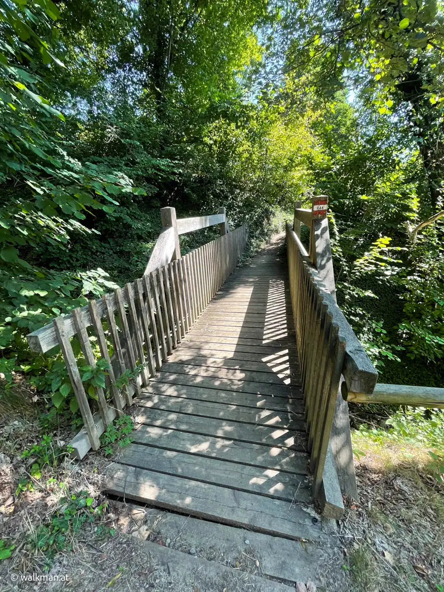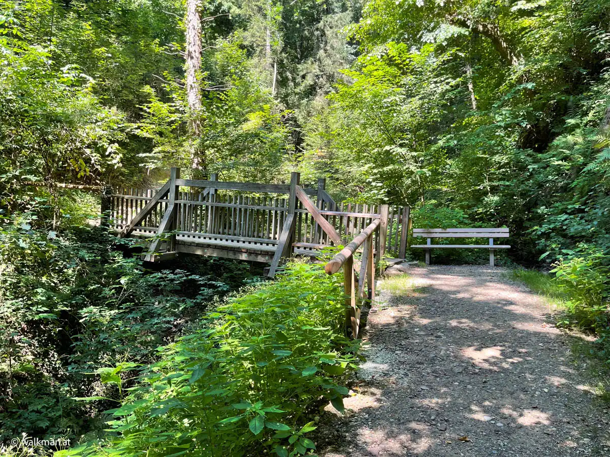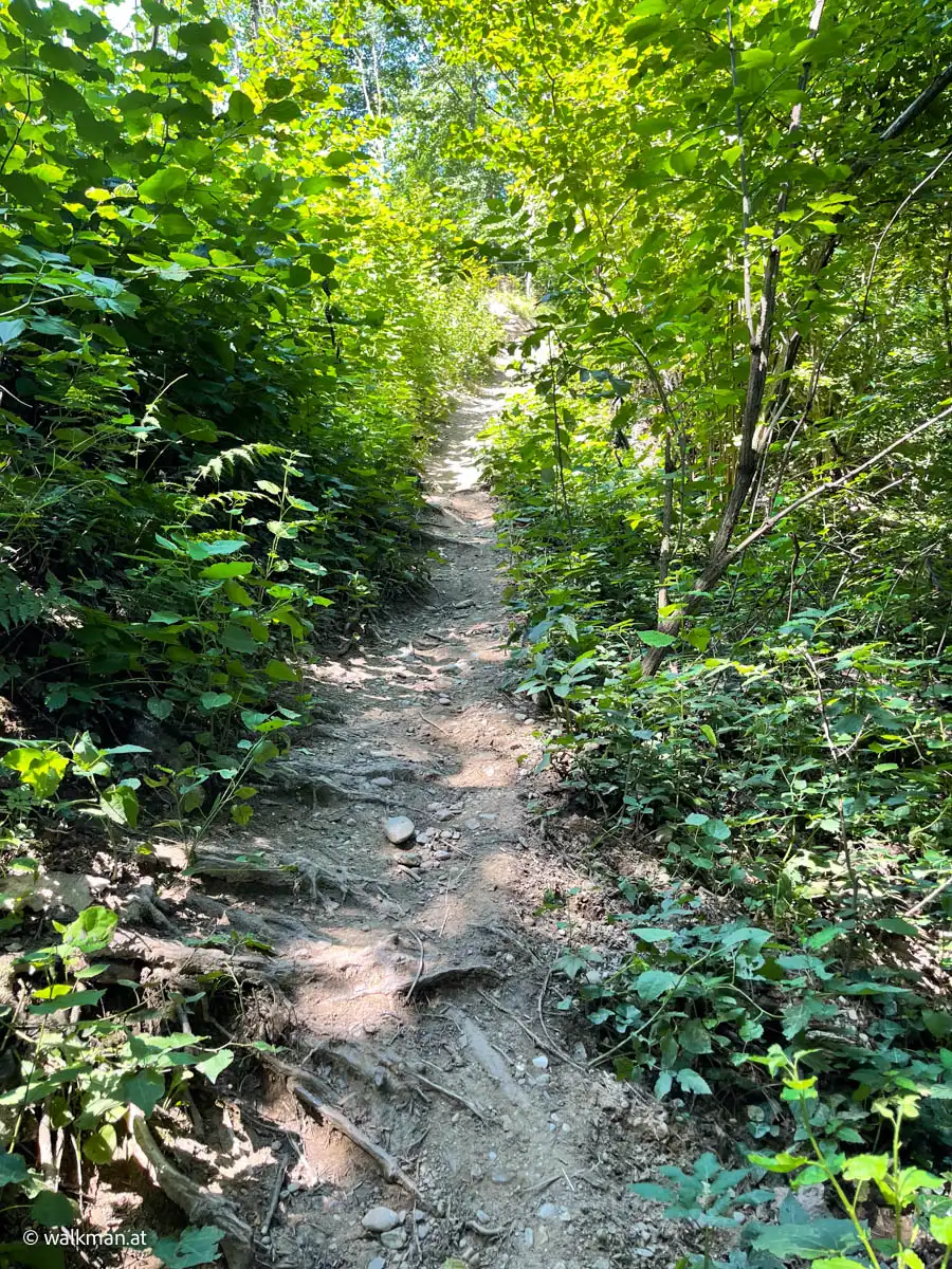 Angenehm. Und schattig. Das war unser erster Eindruck. Der Zweite war: steil und steinig. Über Stock und Stein geht es hier so richtig bergauf. Mitten drinnen ein kleines Bacherl, das bei unserem Aufstieg kaum Wasser führte. Ein kleines Rinnsal ins Tal. Der Weg führt hier mal links, mal rechts neben dem Bacherl rauf. Unterbrochen immer wieder von Brücken, die das Wasser kreuzen.