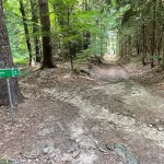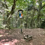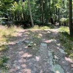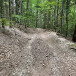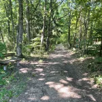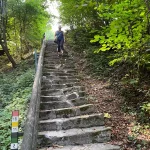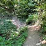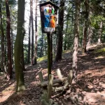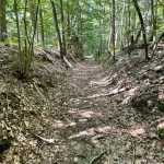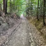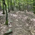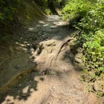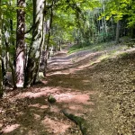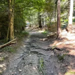 Der Weg führt nun durch einen, sichtlich von Wasser ausgeschwemmten, Waldweg weiter. Wie zuvor, aber noch ein Stück mehr steiniger, mit – ebenso ein Stück mehr – Wurzel übersät. Und natürlich noch steiler. Der „Wandergott“ sorgt selbstlos für unsere Fitness.