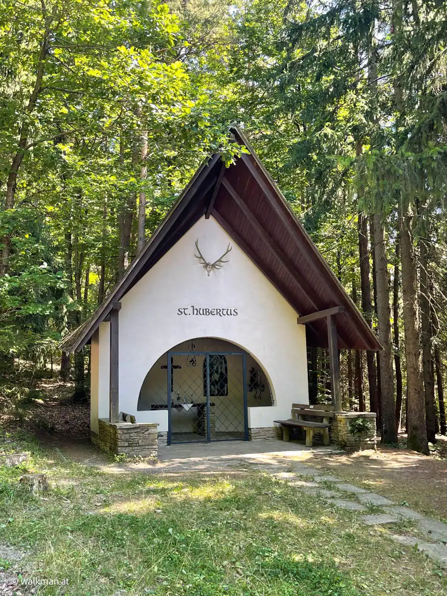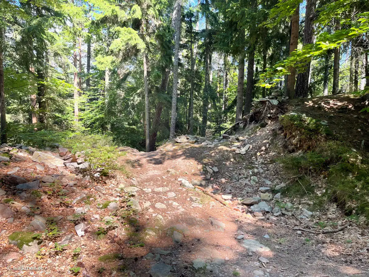 Wir stampfen durch den Wald. Mit wirklich festen Schritten. Anders geht es nun nicht mehr. Der Weg wird steiler. Der Untergrund ist ein typischer Waldweg. Blätterboden wechselt mit steinigem Untergrund, wo sich auch mal eine Wurzel über den Weg legt. Das heißt: die „Fußerl“ g’scheit heben. Immer wieder. Und g’scheit aufstampfen. Immer wieder.