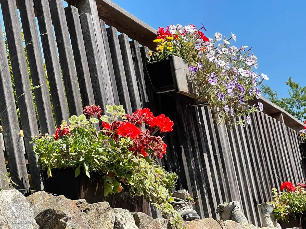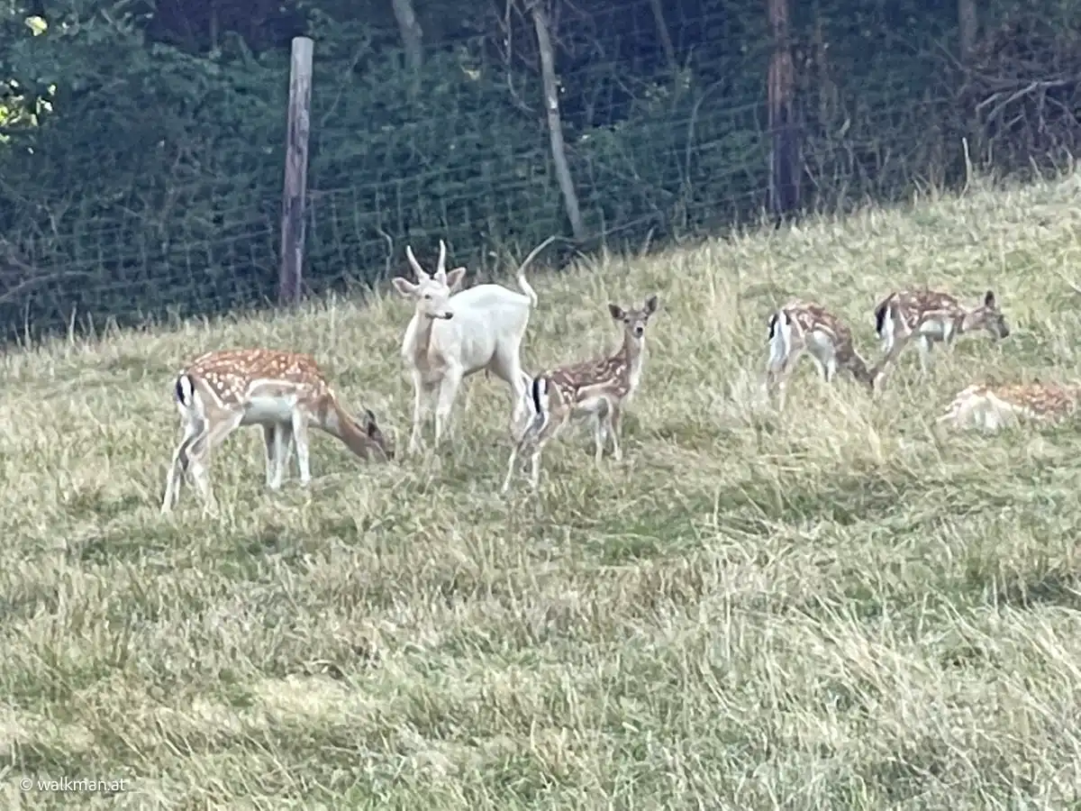 Einmal machen wir noch Rast. Und rauchen eine. Laster verpflichtet. Am Weg runter haben wir noch das eine oder andere Erlebnis zum Staunen und Schmunzeln. Wie zum Beispiel ein originell gestalteter „Hofladen“, der mit Selbstbedienung betrieben wird. Oder tolle, alte Berghäuser. Oder die steinerne Stiege. Oder der weiße Rehbock, den wir mit seiner braunen Verwandtschaft, in einem Gatter erblicken. Auch eine Premiere in meinem Leben.