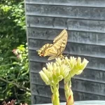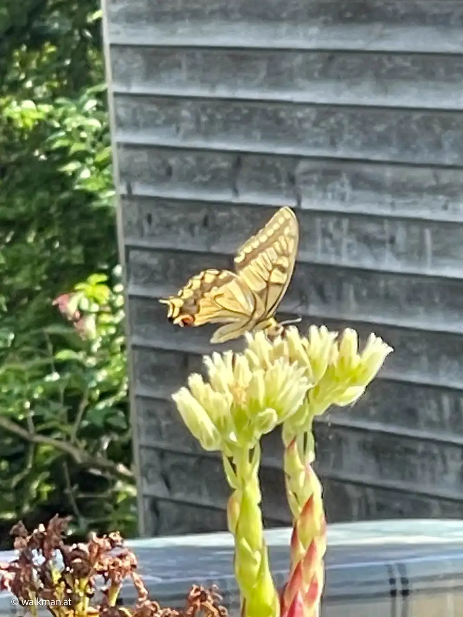 Und auch ein ganz besonderer Vertreter der Spezies besucht uns. Nein, gleich zwei davon. Ein Pärchen der Gattung Schwalbenschwanz. Genial! 50 Jahre alt hab ich werden müssen, damit ich das erste Mal in meinem Leben einen Schwalbenschwanz zu Gesicht bekomme. Fotos, Videos, alles wird jetzt gemacht.