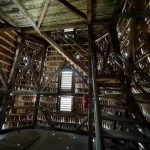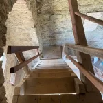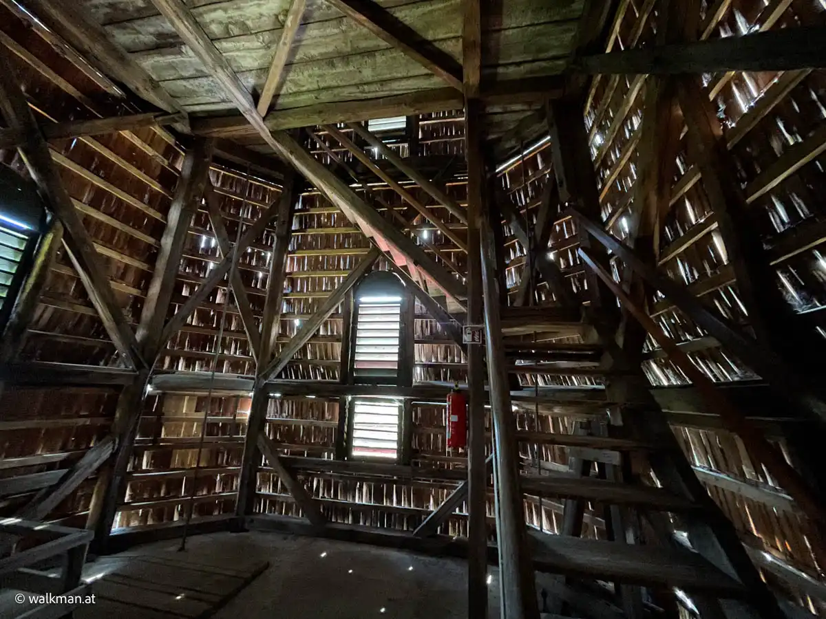 Es knarrt und ächzt. Durchaus altersgerecht. Was auch erstaunlich ist, ist die Sicht von Innen nach Außen. Die Warte ist zwar, am Sockel, mit Steinen gemauert, aber schon ab der ersten Etage besteht die Konstruktion ausschließlich aus Holz. Mit einer genagelten Holzfassade. Wo viel Licht durchblitzt. Also quasi löchrig. Das vermittelt natürlich Stabilität und Sicherheit.