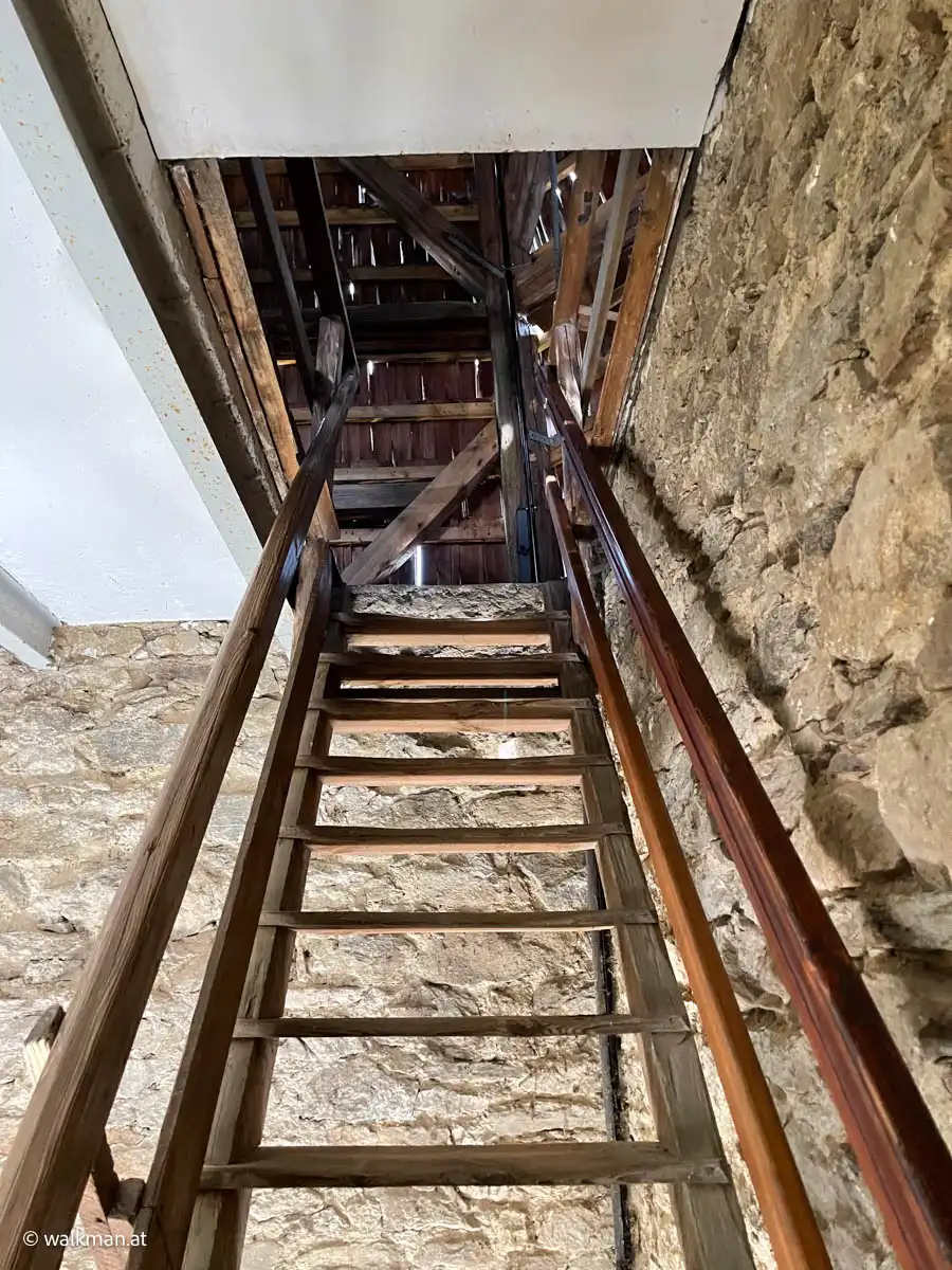 Und das ist eine Extra-Challenge. Die Stufen hier rauf sind extra steil. Vergleichbar mit den bekannten Dachbodentreppen alter Bauernhäuser. Die Warte kann es auch durchaus mit einem richtig alten „Vierkanter“ aufnehmen. Um 1902 erbaut feiert sie kommendes Jahr ihr 120-jähriges Bestehen. Was das Ganze noch ein wenig „interessanter“ macht: 120 Jahre alte Holzstufen!?!!!