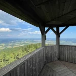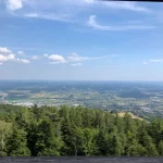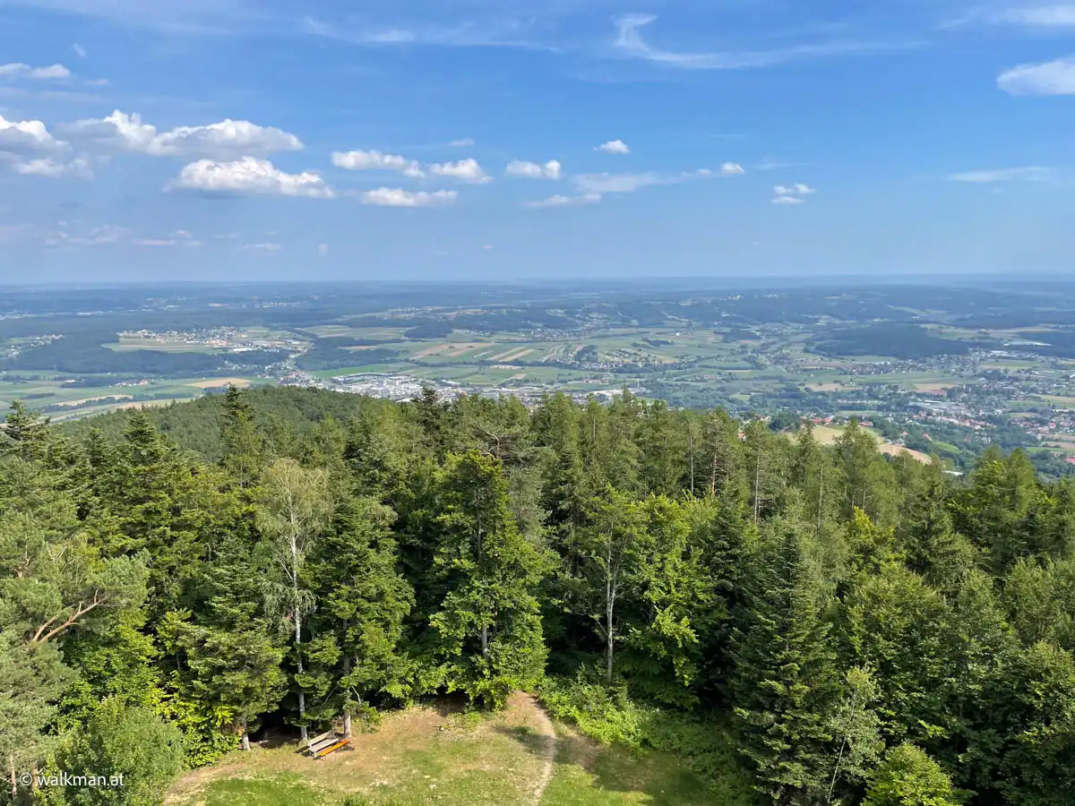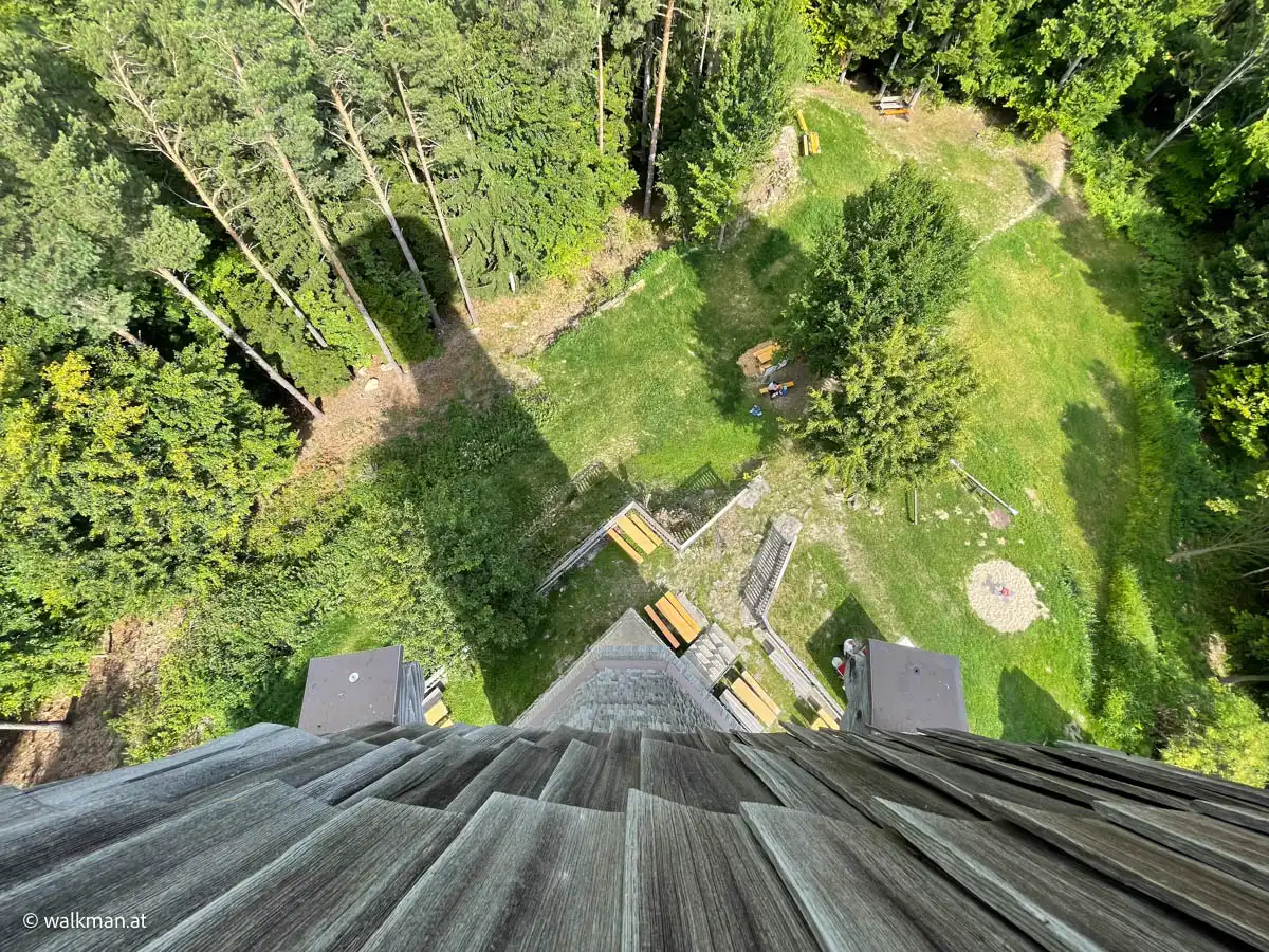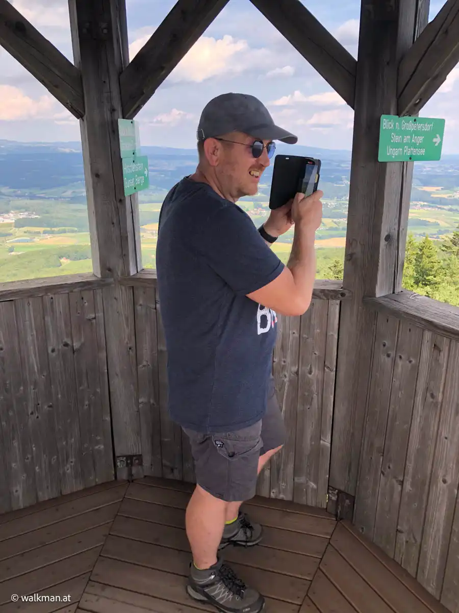 Da weiß man gar nicht, wohin man zuerst gucken soll. Selten so eine tolle Weitsicht gesehen. In meiner Erinnerung ist nur der imposante Ausblick vom Skywalk, auf der hohen Wand, mit diesem Anblick vergleichbar. Oder vielleicht der Geschriebenstein. Aber irgendwie kommt beides hier nicht ran. Und sie ist auch richtig hoch, die Warte. Die Baumwipfel, ein gutes Stück unter uns, sprechen eine klare Sprache.
