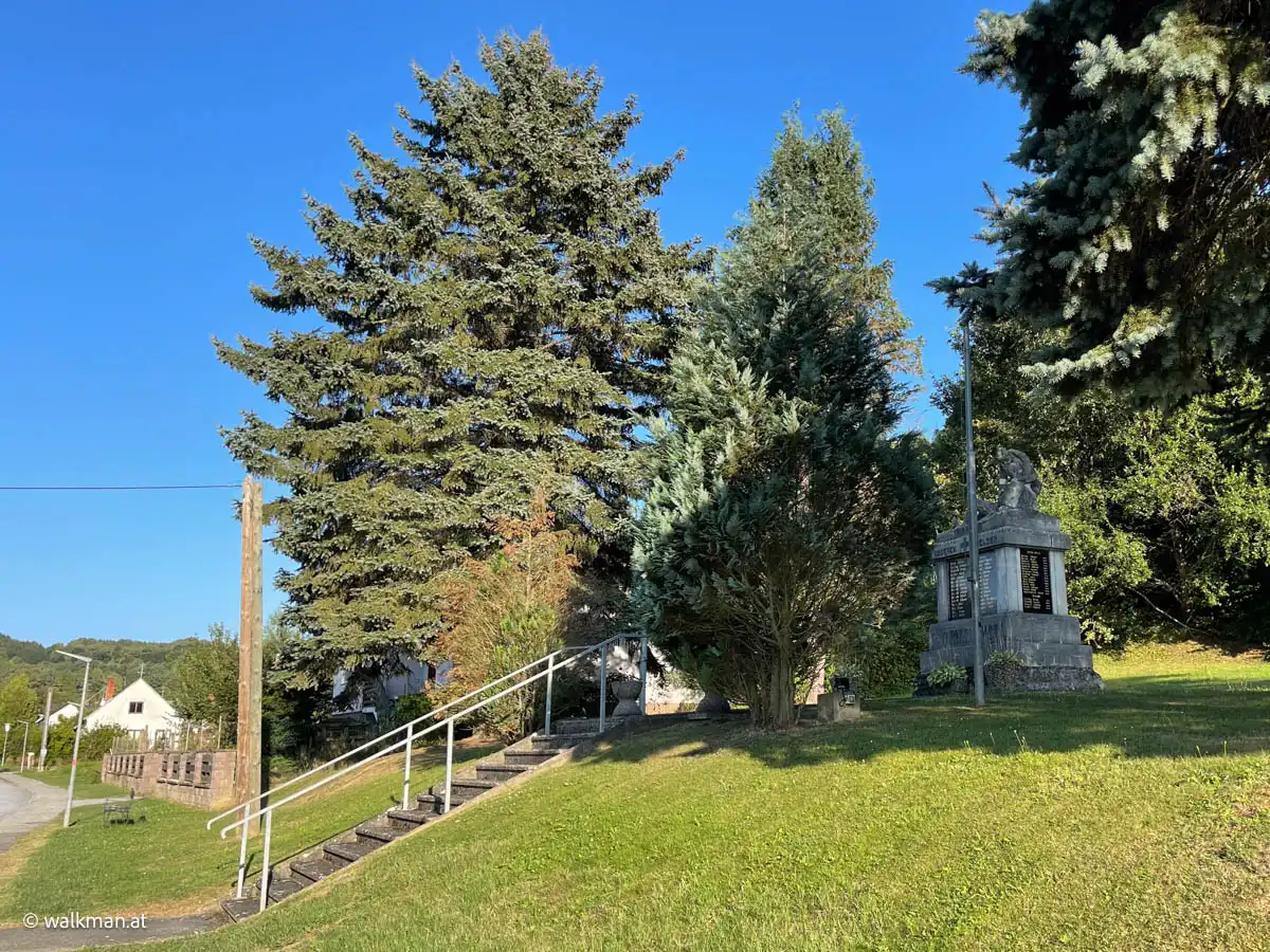 Am dunklen Friedhof vorbei wandere ich nun wieder richtig steil bergab. Mit flottem Schritt. Quasi die „zweite Luft“ in Vorfreude auf das baldige Ende meiner Tour. Und vermutlich hat auch ein „getier“ daran Schuld, dass ich möglichst schnell sitzen will. Der Wolf. Insider kennen das ja, wenns zu brennen anfängt …