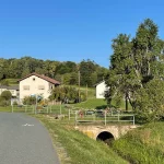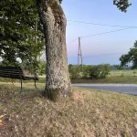 Aber das war es jetzt mit dem „märchenhaften Abschnitt“. Meine Strecke stieg nun wieder an und ich wandere an ein paar vereinzelt stehenden Häusern vorbei. Ein wenig müde war ich nun schon. Und so nahm ich die Gelegenheit dankbar an, die sich mir nach der nächsten Kurve bot. Eine Bank zum Rasten. Mit ein wenig Aussicht. Hier machte ich nun, nach knapp 4 Kilometern heute, mal Pause.