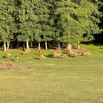 Nach ein paar weiteren Minuten lasse ich die Wildgesellschaft in Ruhe weiter äsen und wende mich wieder meinen Prioritäten zu. Ich habe eine Tour zu gehen. Also weiter! Während ich mich wieder in Bewegung setze, stelle ich mir grade die Gedanken von Reh und Hirsch vor: „Wird eh schon Zeit. Nicht mal in Ruhe fressen kann man. Immer diese Touristen!“