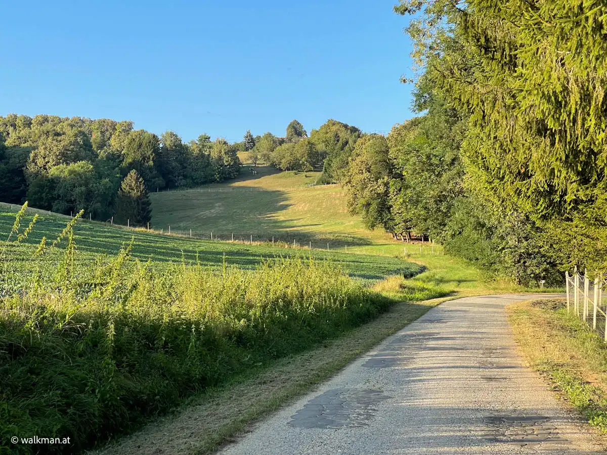 Ein paar Fotos von der Rastmöglichkeit, dem Marterl mit Bank, geknipst, und schon gehts weiter, was immer mich erwarten mag. Auf diesem Abschnitt wandert man aus Neustift hinaus, durch ein sanftes Tal, das sich immer weiter nach hinten erstreckt. An Wiesen und Feldern vorbei und bewaldeten Hängen zur Rechten. Dies auch weitgehend flach, wenn auch ganz leicht ansteigend. Das merkt man aber gar nicht.