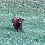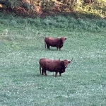 Wobei ich eher glaube, dass die beiden sicher nicht auf mich „gewartet“ haben. Die zwei ausgewachsenen Ochsen, mit ziemlich gefährlich aussehenden mächtigen Hörnern, zeigen zwar ein wenig mehr Aufmerksamkeit meiner Person gegenüber, als die Wildgesellschaft zuvor. Grasen (oder Äsen?) dann aber doch relativ uninteressiert weiter.