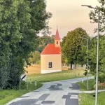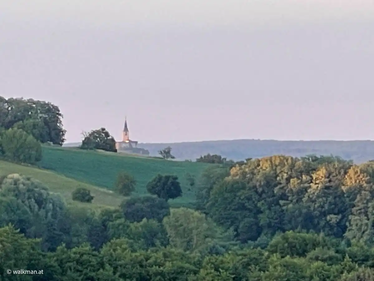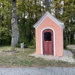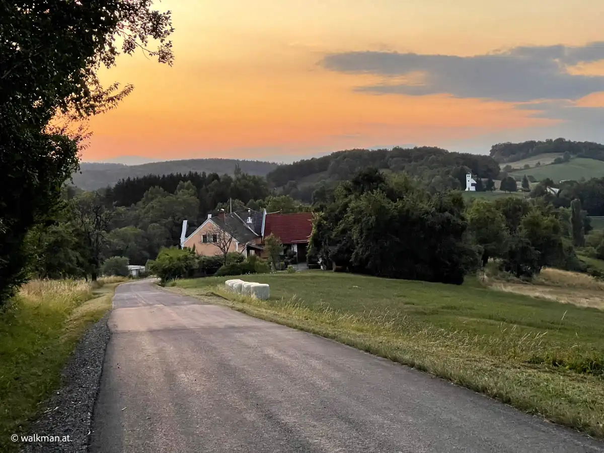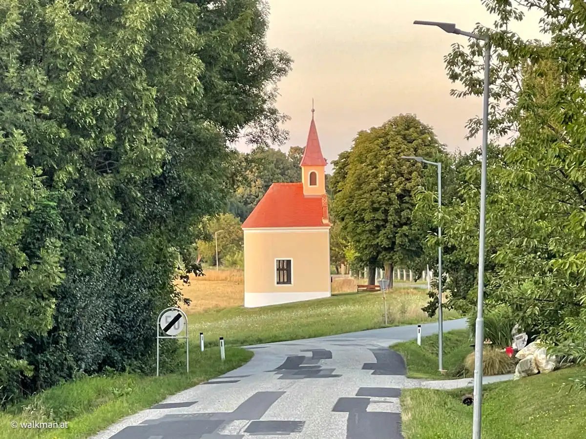 Nach etwa 48 Minuten Gesamtzeit wandere ich nun über meinen ersten Gipfel heute. Der Wiederberg ist „erklommen“. Und ich entscheide mich auch hier, bei einer Kapelle, rechts abzubiegen. Eben auch die längere Variante. Jetzt wollte ich es wissen, wie es am Fuchsberg aussieht. Der zweite Gipfel sollte heute auch noch „fallen“. Und dann gleich wieder links, die nächste Straße hinab.