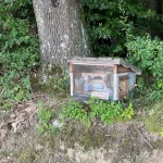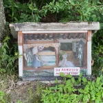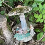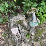 Doch schon ein paar Meter weiter, die Straße hinab, werde ich vom nächsten Highlight in meiner Entscheidung bestätigt. Und fast hätte ich das auch übersehen. Links von mir, am Waldrand entdecke ich am Fuße eines Baumes einen kleinen „Gruß an den Wanderer“. Ein entzückendes Arrangement aus geschnitztem Holz. Ein kleiner Mann, der unter einem „Glückspilz“ steht. Und daneben ein Schild: