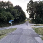 Weiter geht’s. Vor mir liegt nun eine kleine Siedlung. Da muss ich durch. Der Untergrund ist nun wieder asphaltiert, nach dem waldigen Schotterstück hinter mir. Und steigt wieder merklich an. Ansprechend wäre wohl das geeignetere Wort. Und zum Schluss, auf den letzten Metern zur Querstraße hinauf, richtig herausfordernd mit etwa 25-30% Anstieg.