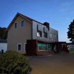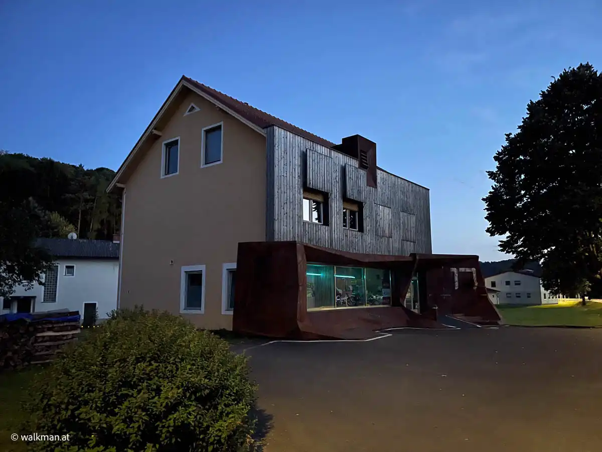 Aber halt, etwas war da doch noch. Dieses eine Haus. Das nicht zu übersehen ist. Nun endlich auf im Handy verewigt. Was ich damit beschreiben will, ist ein vollkommen außergewöhnliches Haus mit einer straßenseitigen Fassade aus Lärche. Doch der untere Teil dieser besteht aus beweglichen Eisenelementen auf ungestrichenem Metall. Rostrot eben. Die der Fassade vorgelagert sind. Sieht brachial genial aus. Und mitten drinnen ein Schaufenster mit einem alten Oldtimer-Motorrad.