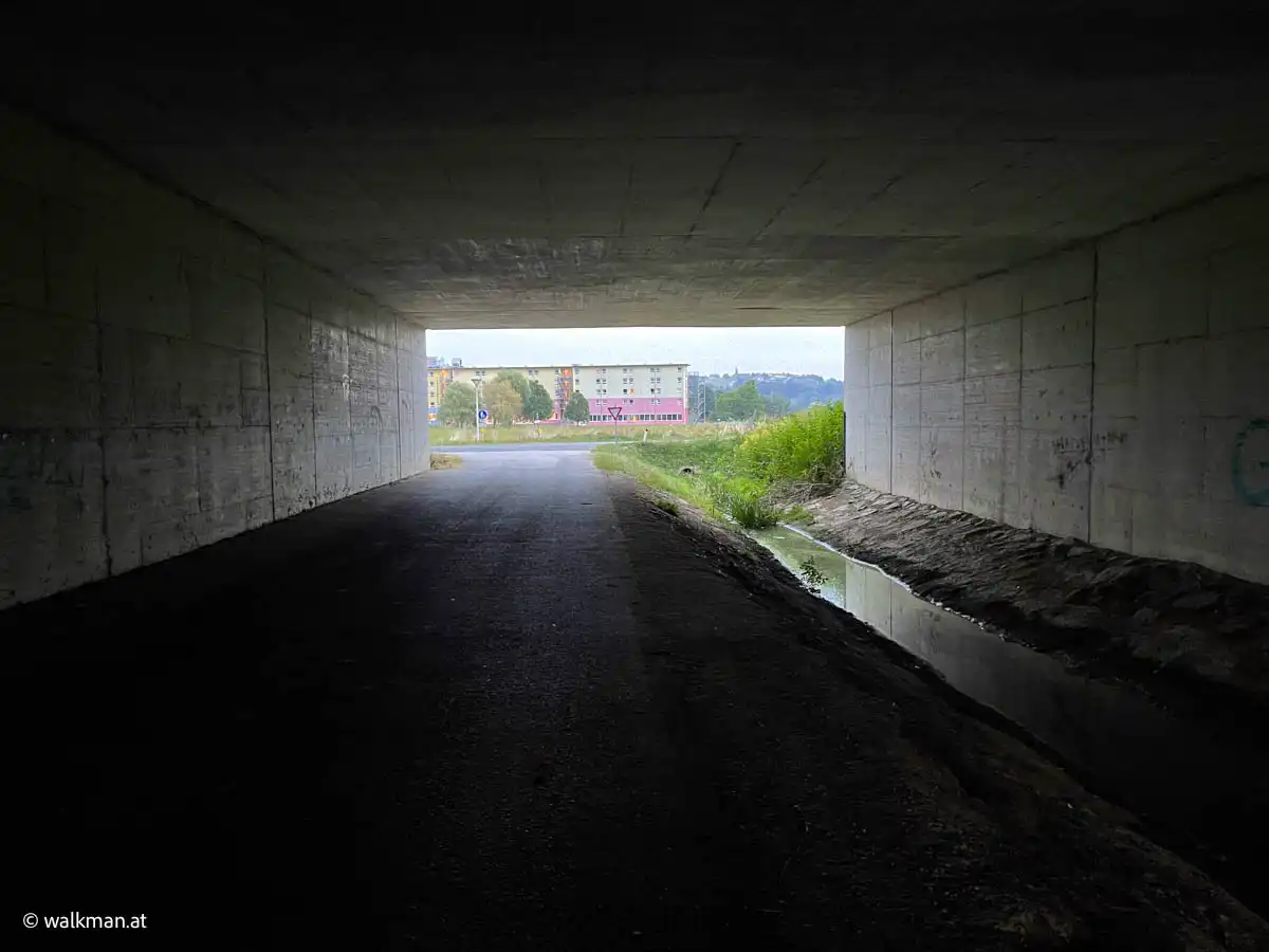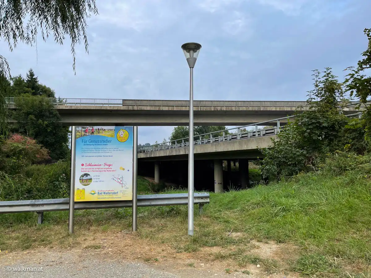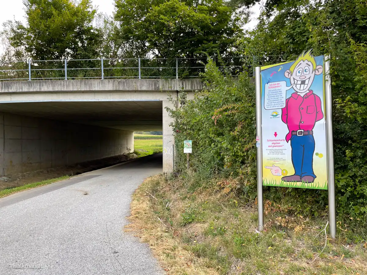 Die Route ist an und für sich angenehm, fast komplett flach. Die zehn Höhenmeter, die sich auf die gesamte Strecke verteilen, sind weitgehend zu vernachlässigen. Ausgangspunkt meiner Variante der Tour ist der Parkplatz der H2O Therme. Von diesem nun, entweder den Trampelpfad beim Baumlehrpfad entlang oder die geschwungene Straße nach hinten, zur Unterführung unter der A2 hindurch, dann rechts. Hier, bei der Unterführung, ist auch der offizielle Startpunkt des Schlaumeierwegs.