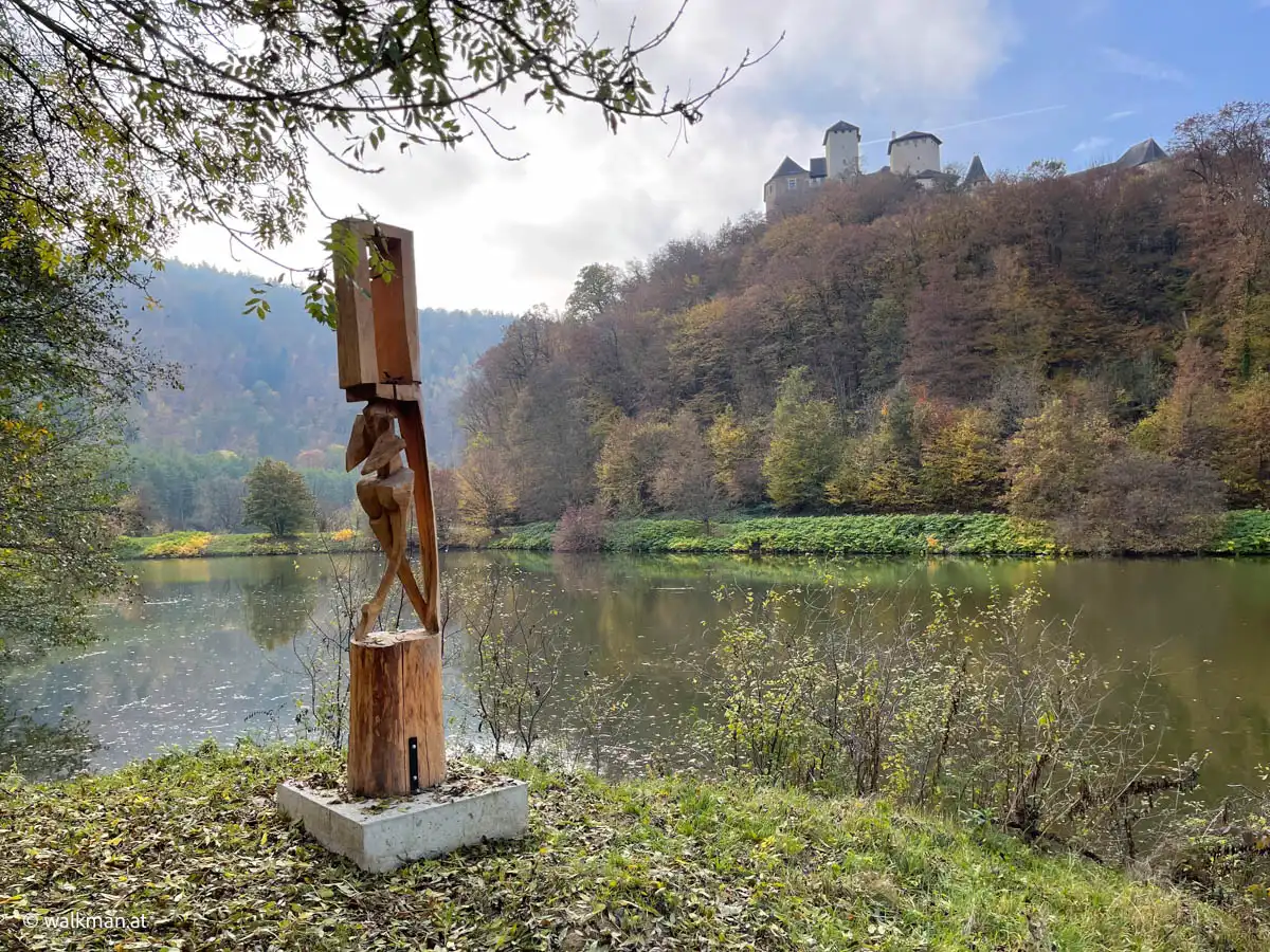 Und hier unten, rund um den Burgteich, war zu dieser traumhaften Kulisse nun Erholung angesagt. Gemütliches Spazieren. Vorbei an einigen geschnitzten oder gesägten (wird das nun als Schnitzerei oder Sägerei bezeichnet?!?) Kunstwerken, die, nach den Bearbeitungsspuren, allesamt mit einer Kettensäge angefertigt wurden. Leider ist aber nirgendwo an den originellen, kunstvollen Statuen ersichtlich, wie der Name des betreffenden Künstlers lautet. Oder ich hab dies „in der Hitze des Gefechts“ einfach übersehen.