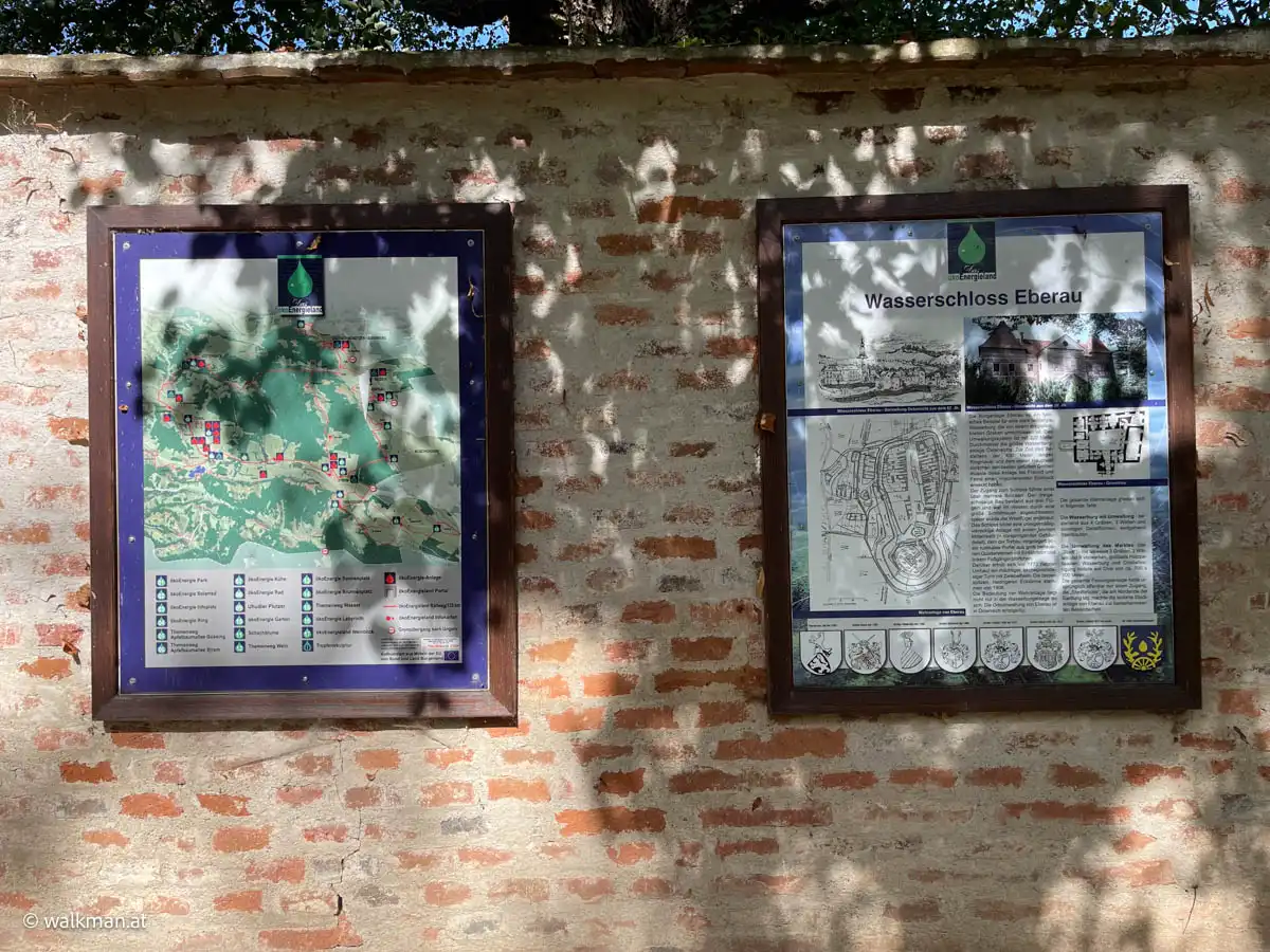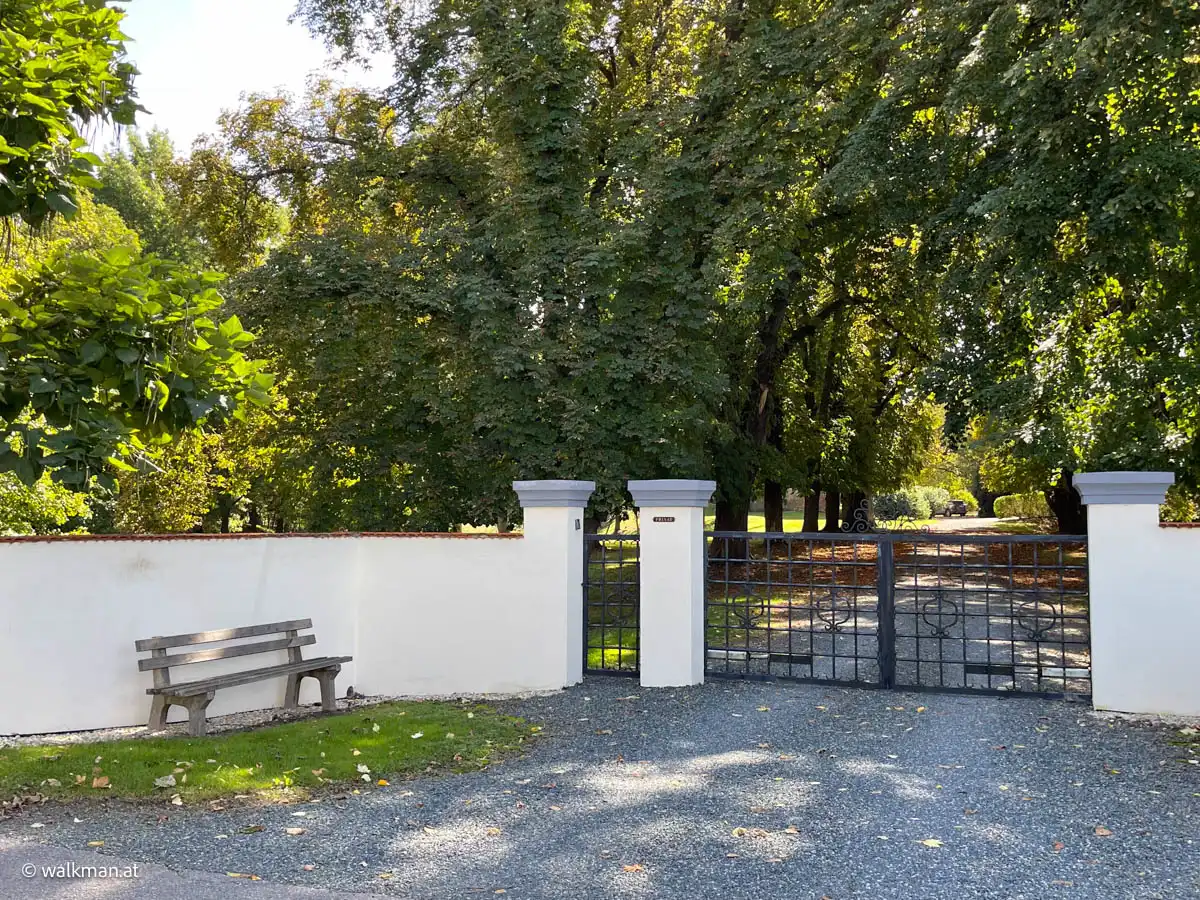 Und genau bei diesem Schloss wanderte ich nun wieder vorbei. Gestartet war ich am Hauptplatz in Eberau. Dort findet man auch genügend Parkmöglichkeiten für den PKW. Weiterfolgend an der Kirche vorbei, gleich rechts rein beim Schloss, führt nun mein Weg an der Schlossmauer entlang.