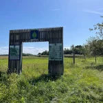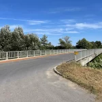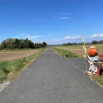 Wieder an der Bundesstraße angekommen, wandere ich rechts weg über die Pinkabrücke, um danach wieder gleich rechts in die „Pampa“ abzubiegen. Hier steht einer der typischen „Öko-Land“-Bögen, die, verteilt über das Südburgenland bzw. speziell den Güssinger Bezirk, immer eine besondere Stelle markieren.