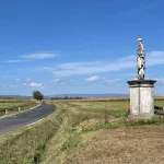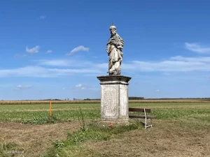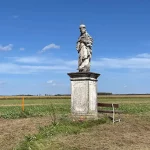 Da möchte ich jetzt aber nicht hin. Mein Weg führt links weg. Die besagte Straße entlang bis zur nächsten Wegkreuzung. Hier wartet ein geplantes Highlight der Tour: Eine Marienstatue mit einer kleinen Bank. Zeit für eine Pause.