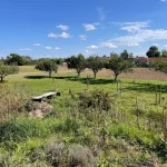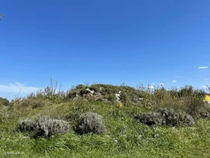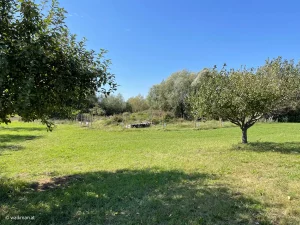 Dieser entpuppt sich ein wenig später als eigens dafür angelegt. Eine Art riesige, begehbare „Kräuterspirale“. Und darunter, am Fuße dieser, sind rundherum Bäume angepflanzt. Jeder mit eigenem Info- und Widmungsschild. Hier führt auch ein Weg hindurch nach hinten, zum Teich, den ich nun entlang spaziere.