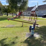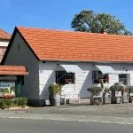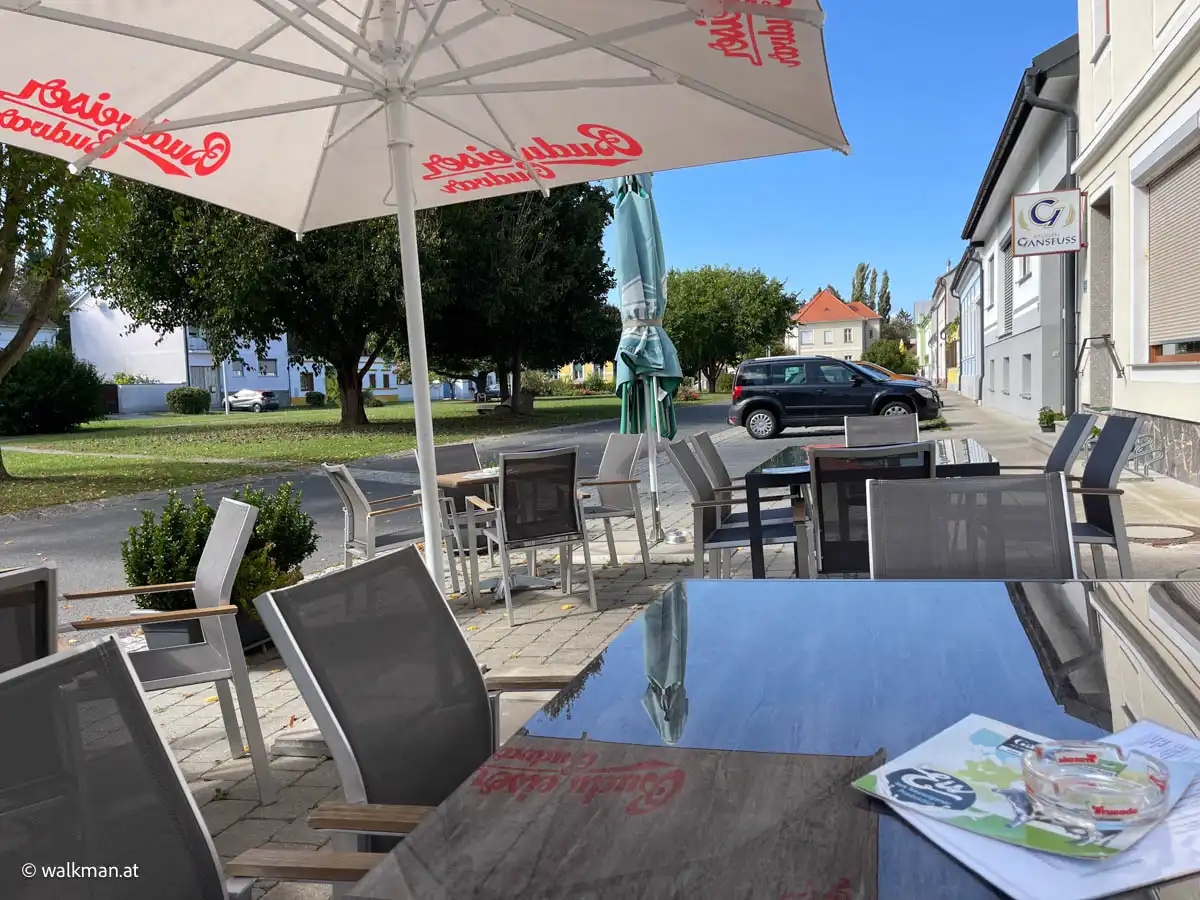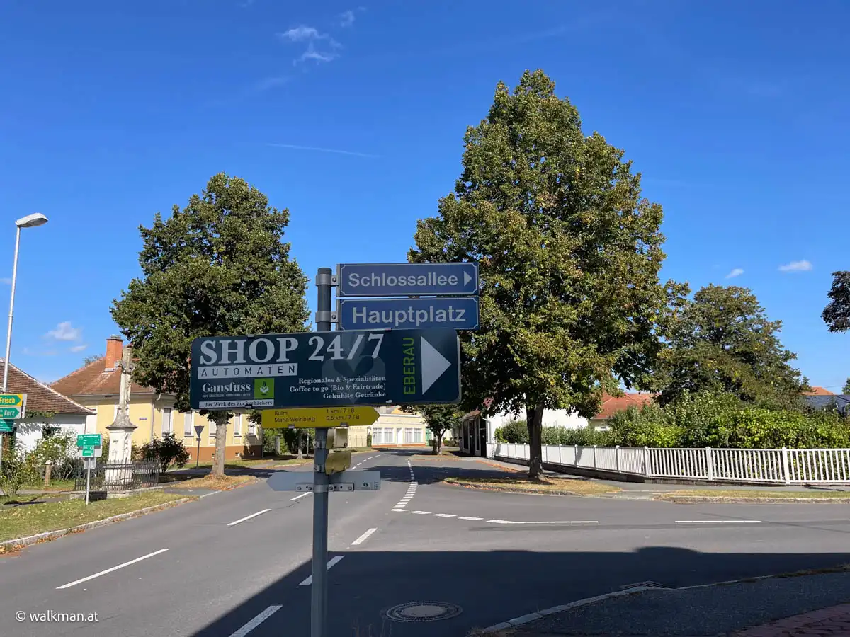 Etwa 600 Meter später bin ich dann aber auch schon, vorbei an schmucken Gärten, wieder im Ort, an der Brücke, zwischen Eberau und dem Ortsteil Kulm, angelangt. Hier nun links weg, über die Brücke nach Eberau hinein. Die Hauptstraße entlang. Und bald darauf, beim Feuerwehr- und dem Gemeindehaus, auch schon wieder rechts rein, zum Hauptplatz.