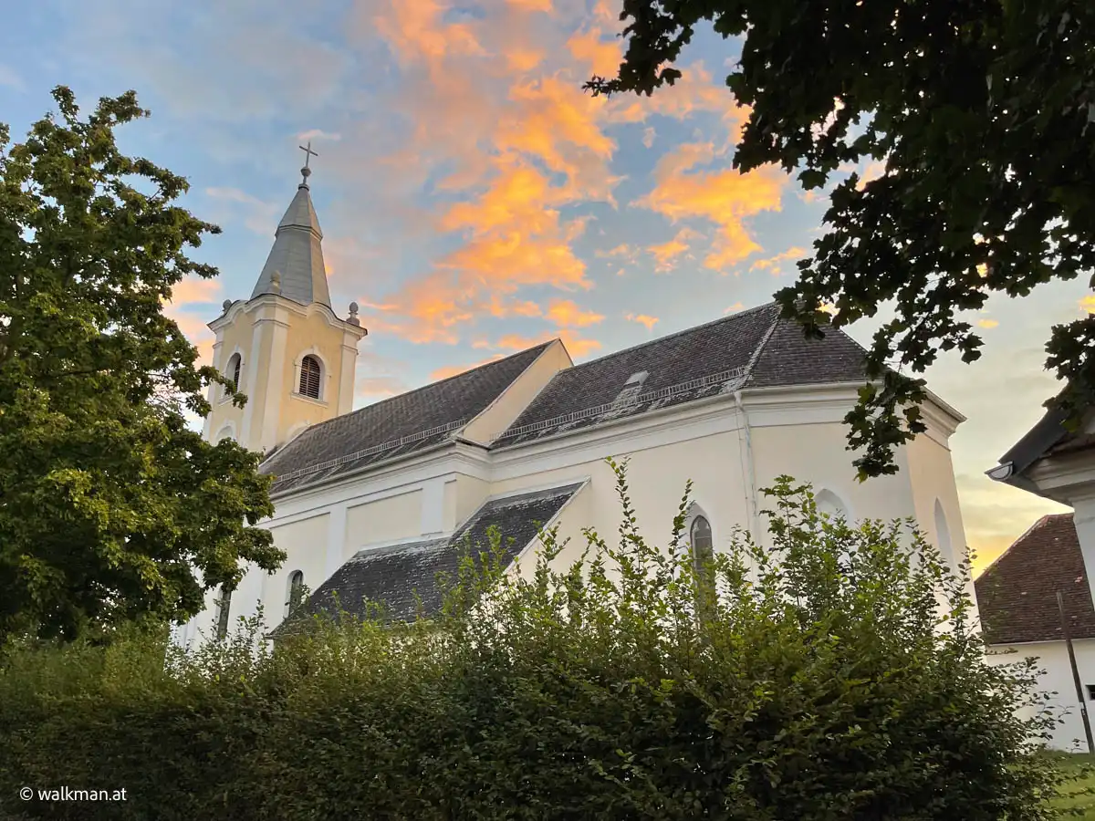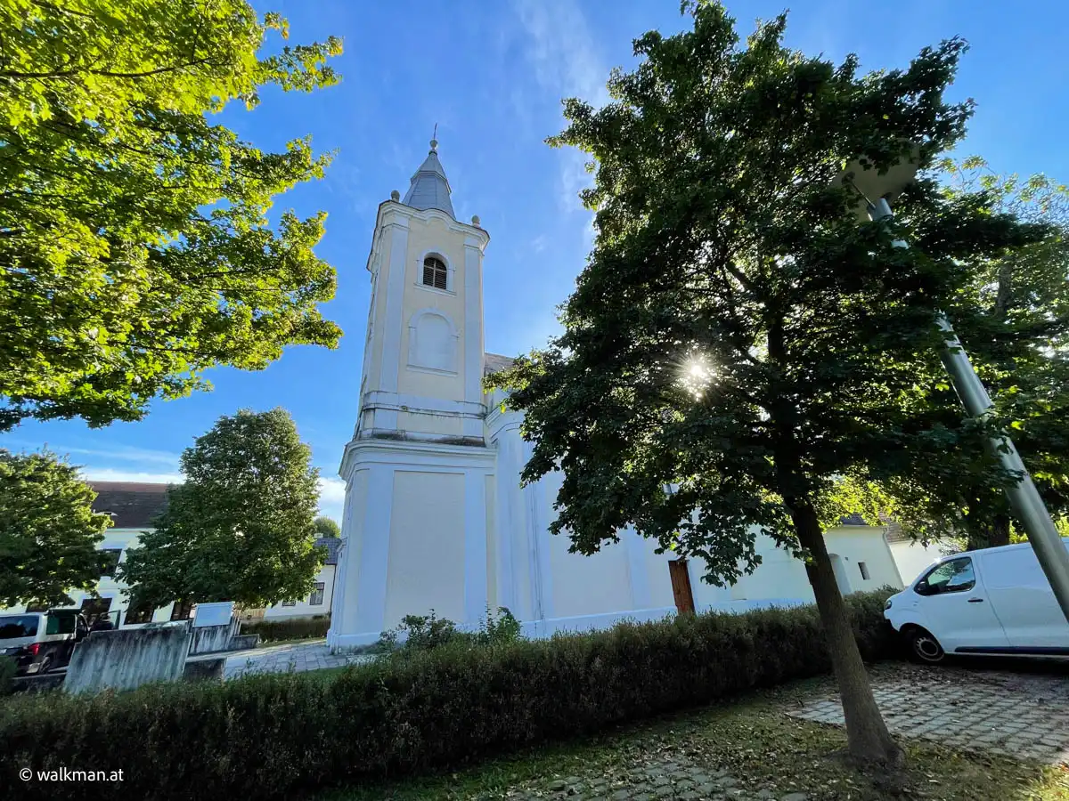 Bei der Kirche in Eberau war, um halb sieben Uhr morgens, schnell ein Parkplatz gefunden. Alternativ sind hier auch genügend Möglichkeiten um den Hauptplatz. Ist aber kaum nötig. Ich persönlich habe hier immer maximal zwei parkende Autos angetroffen. Also Auto abgestellt. Tracker On. Trinkflaschengürtel angeschnallt. Und los gehts.