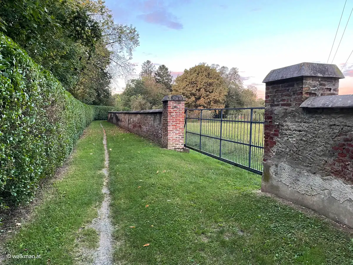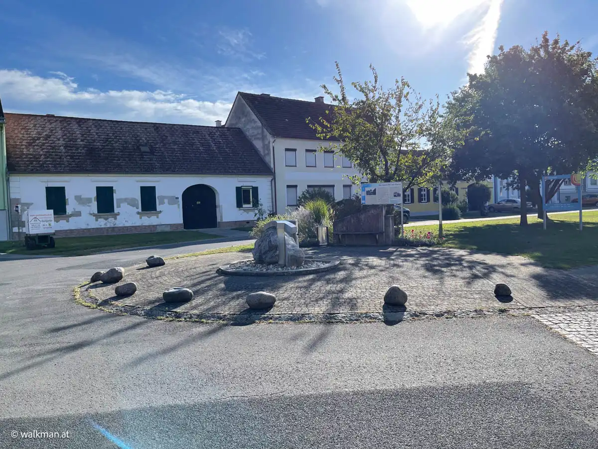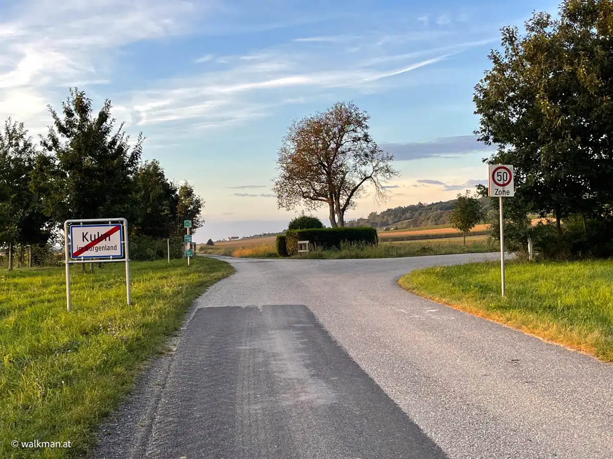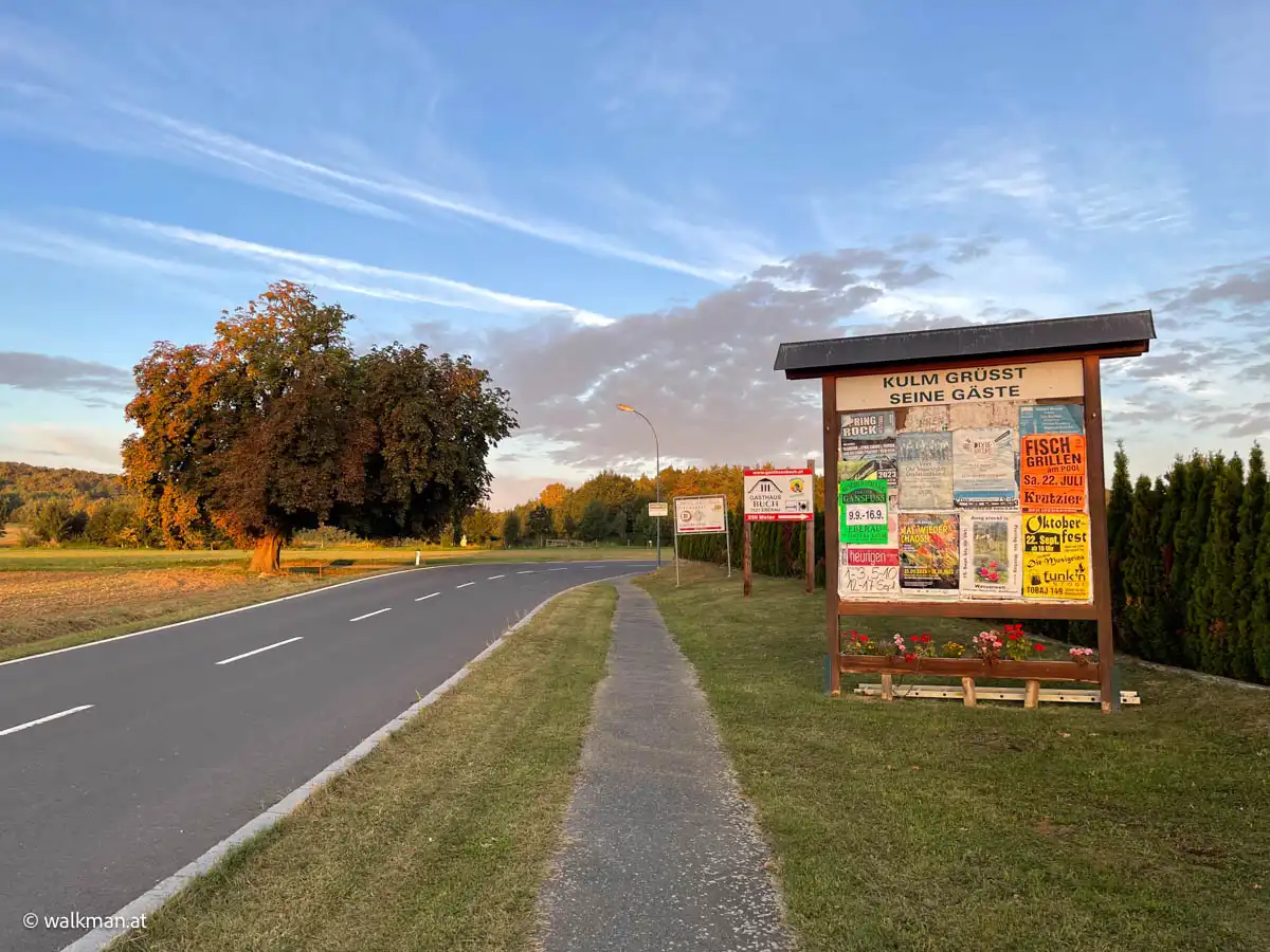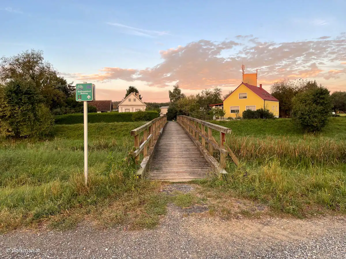 Zunächst führt die Route nach Westen, auf der nördlichen Seiten des Wasserschlosses entlang. Weiter über die hölzerne Pinka-Brücke hinüber in den Ort Kulm. Hier treffe ich auf mein erstes unverhofftes Highlight.