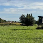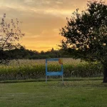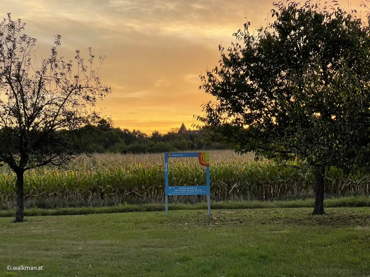 Mit dem blauen Fotorahmen kann man aktuell so gut wie gar nichts anfangen. Hoher Mais macht das geplante Motiv, eben das Wasserschloss, im Hintergrund zunichte. Aber das ist das auch schon die einzige Kritik, die mir spontan einfällt. Ansonsten ist der Platz wirklich schön und gepflegt. Und die aufgehende Sonne im Hintergrund beschert mir dann auch noch wirklich schöne Fotos. Das macht Spaß. So kann der Tag heute weiter gehen.