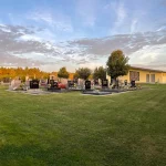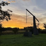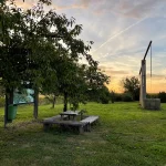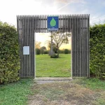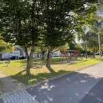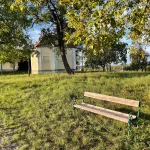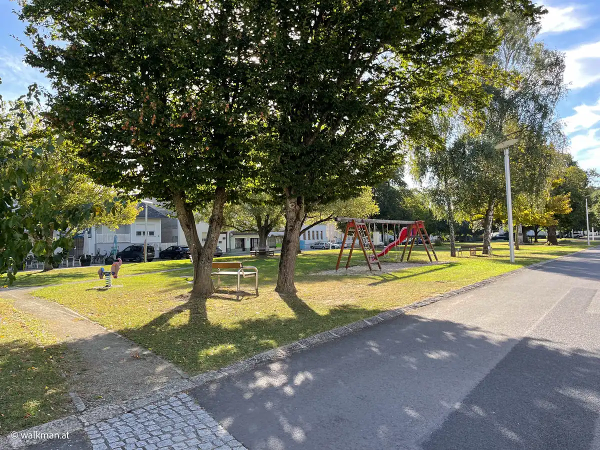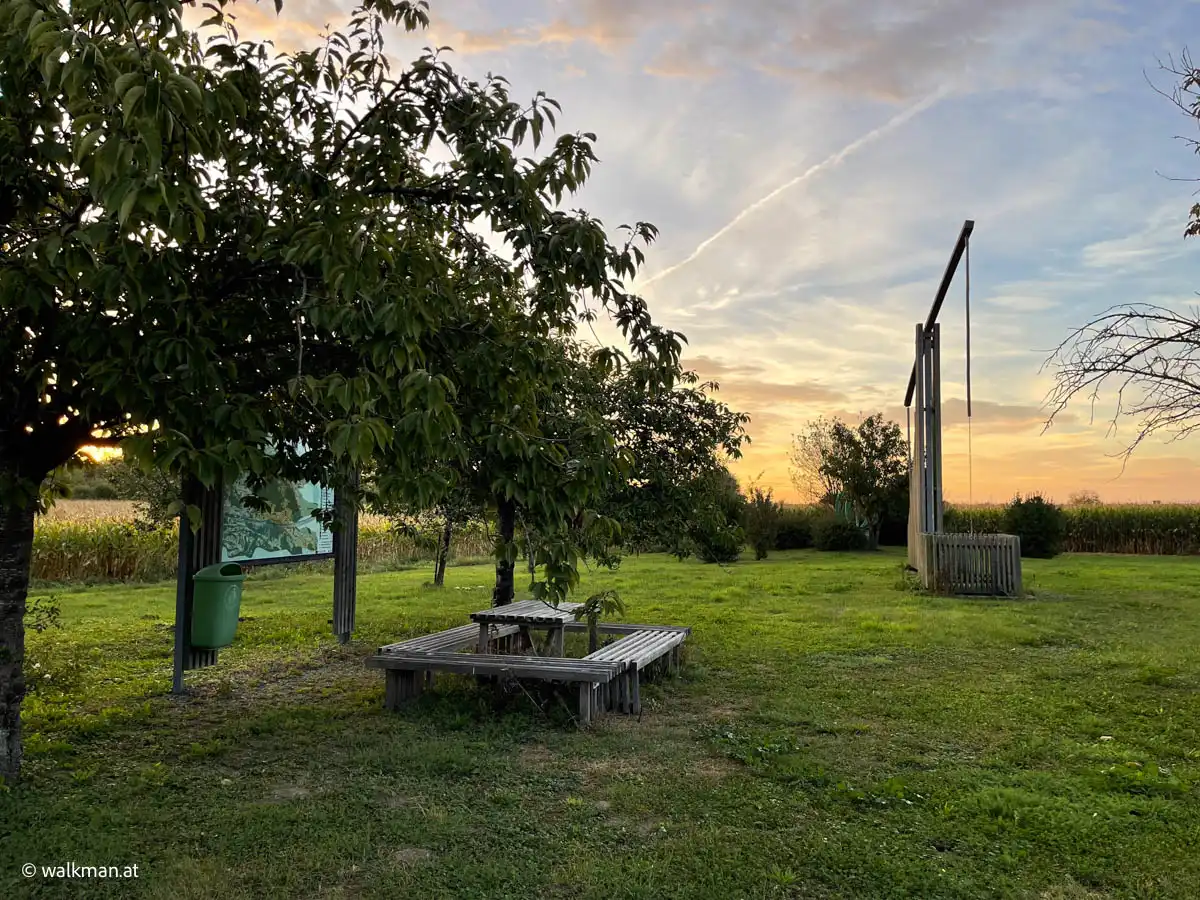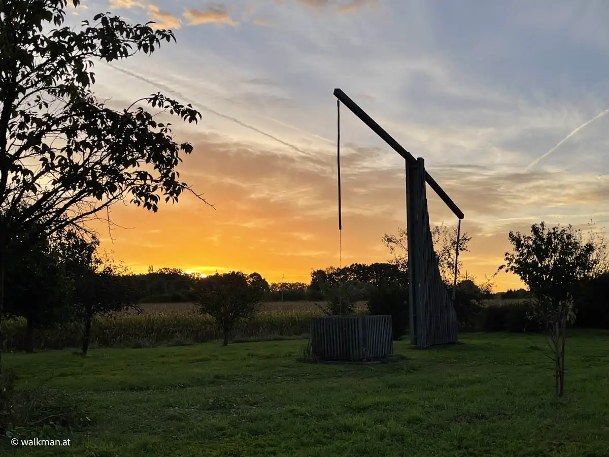 Durch das Lärchentor schreitend sieht man dann auch schon das schöne Arrangement. Bestehend aus einem blauen „100 Jahre Burgenland“ Fotorahmen, der Richtung Wasserschloss ausgerichtet ist. Weiters aus einer Sitzgruppe mit Info-Tafeln daneben. Und einem alten Brunnen, samt dem typischen, markanten, hölzernen Hebel.